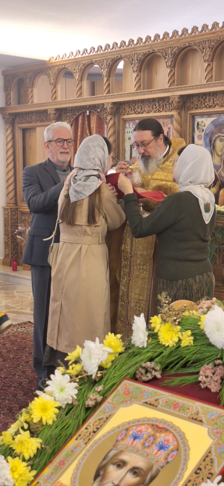 После отпуста Божественной литургии было совершено славление празднику святителя Николая Чудотворца и прочитана молитва святому. Проповедь на тему праздника произнес архимандрит Филипп. Затем настоятель поздравил с прошедшим днем Ангела регента Подворья Екатерину Баранову и постоянную прихожанку Екатерину Масри, вручил им памятные подарки и возгласил многолетие.