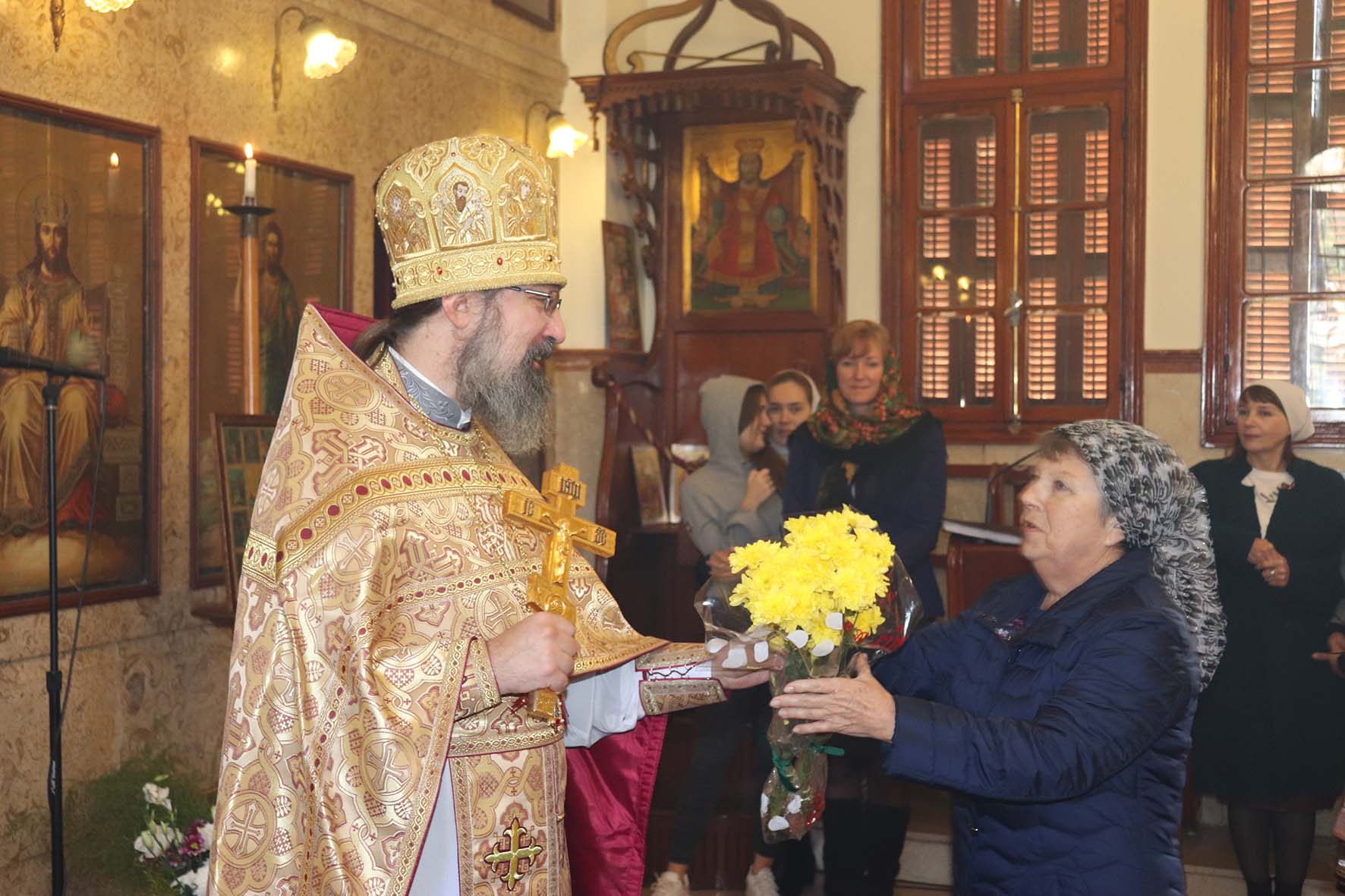 После отпуста Божественной литургии архимандрит Филипп поздравил прихожан, праздновавших на прошедшей седьмице день Ангела, подарил им по букету цветов и провозгласил многолетие.