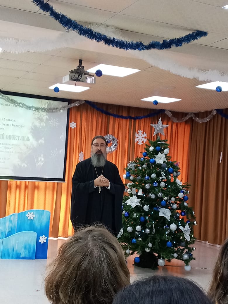 Перед началом спектакля с приветственным словом к воспитанникам школы, преподавателям, родителям и всем гостям праздника обратился архимандрит Филипп.