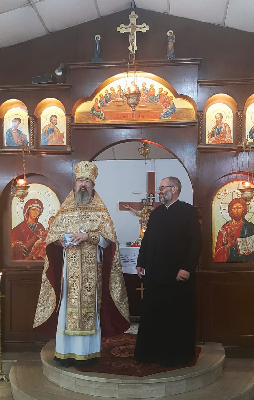 После отпуста Божественной литургии архимандрит Филипп приветствовал протоиерея Булоса, поздравил его с прошедшим Днём Тезоименитства и подарил памятные подарки.