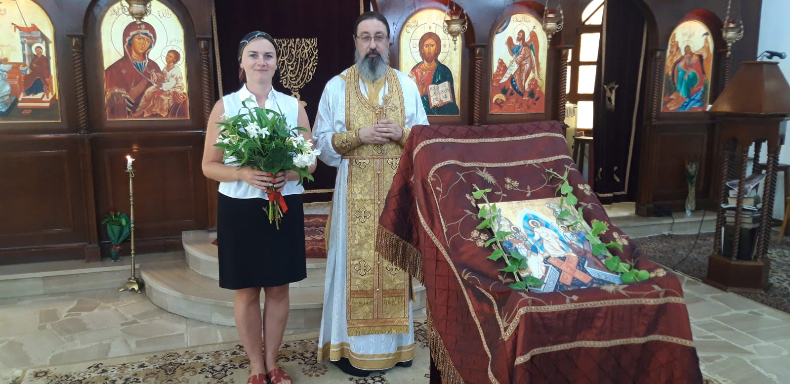 Затем настоятель поздравил с прошедшим Днём Ангела постоянную прихожанку и сотрудницу Подворья Наталию Кабалан и подарил ей богослужебную просфору и букет цветов.