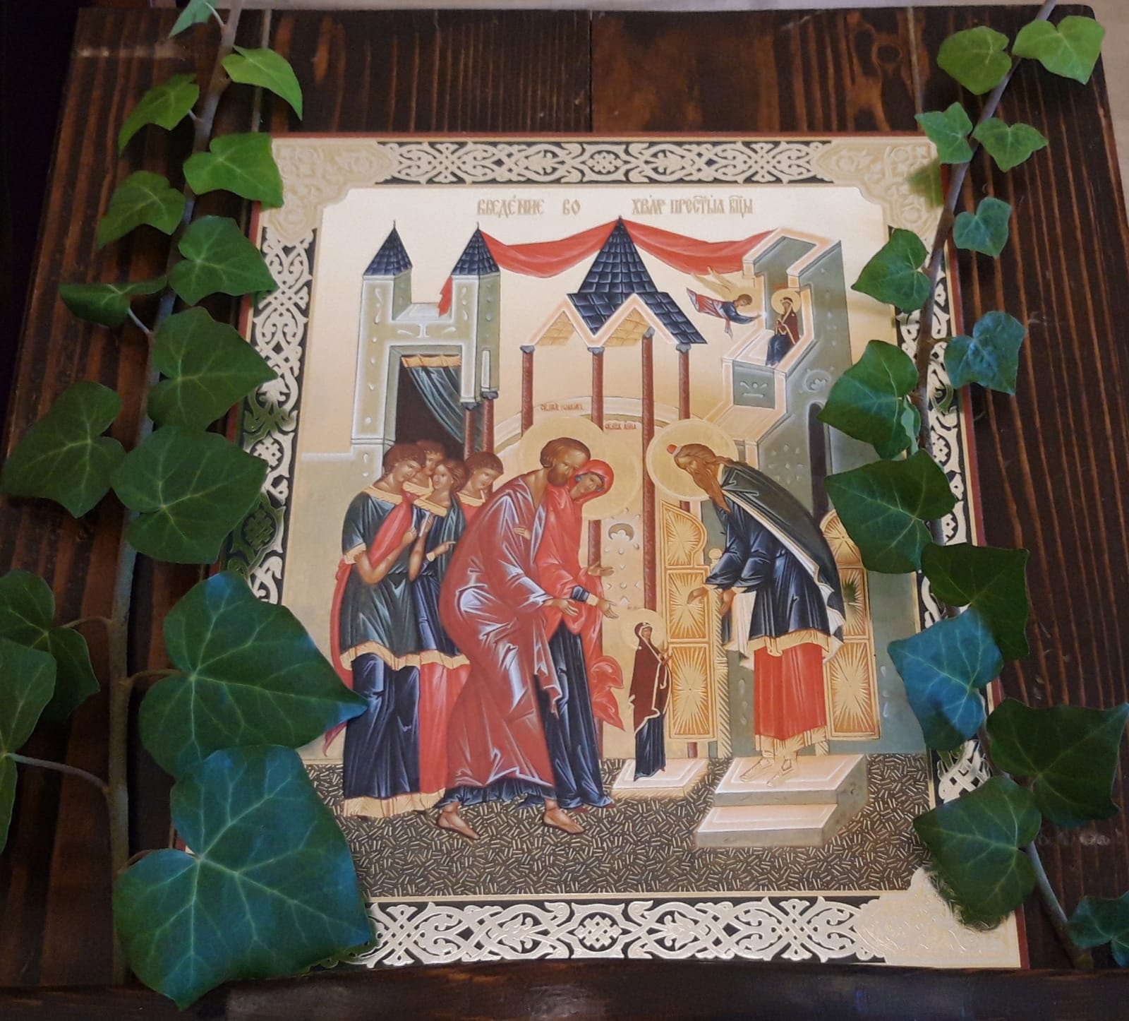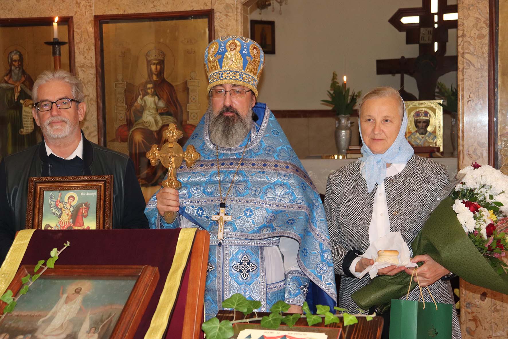 Затем настоятель Подворья поздравил с днём рождением и прошедшим днём Ангела Ирину и Димитрия Зелениных и вручил им памятные подарки.
