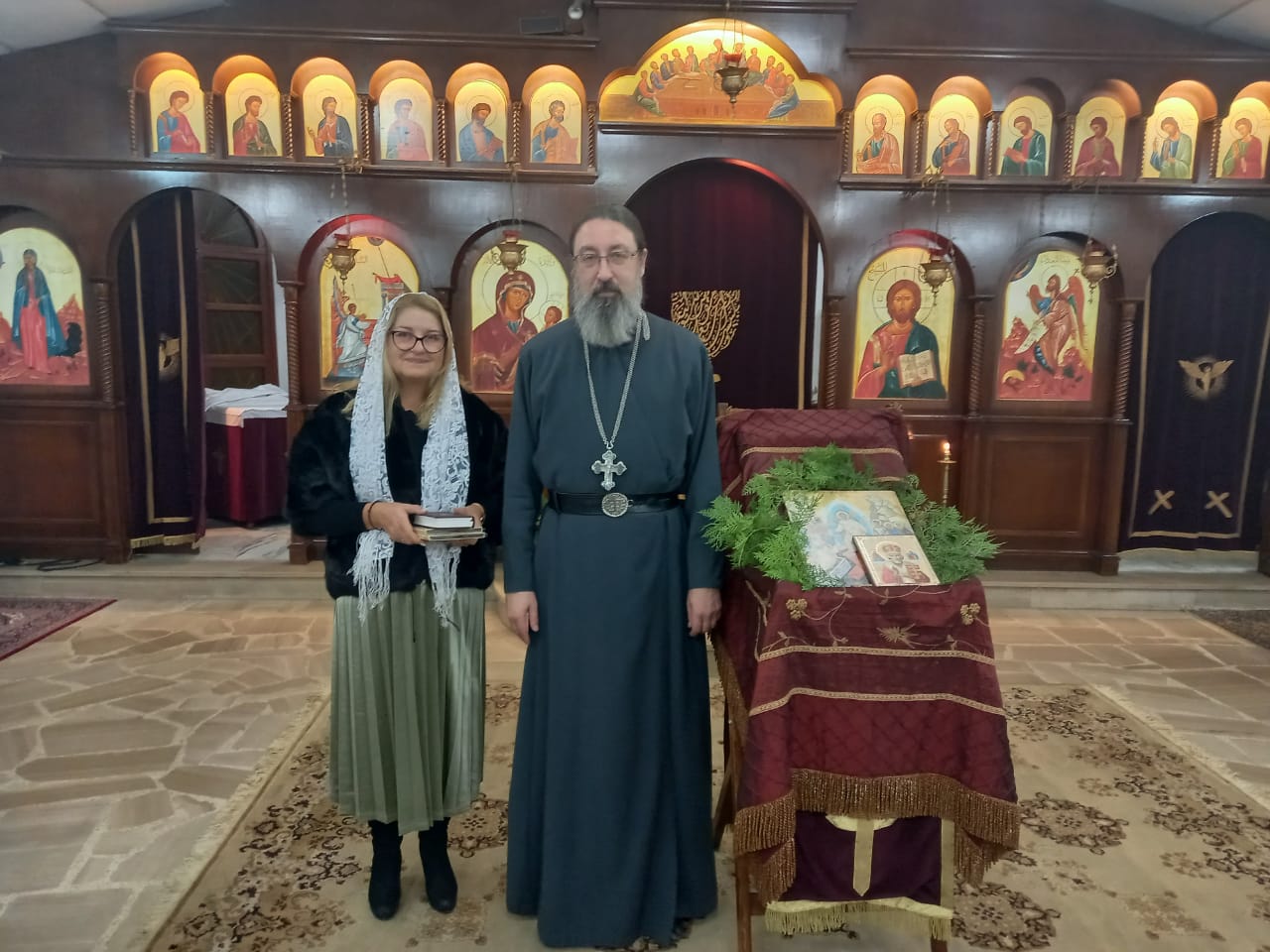 После окончания Воскресной вечерни архимандрит Филипп поздравил с прошедшим Днём рождения постоянную прихожанку Подворья Татьяну Алам и подарил ей памятные подарки.