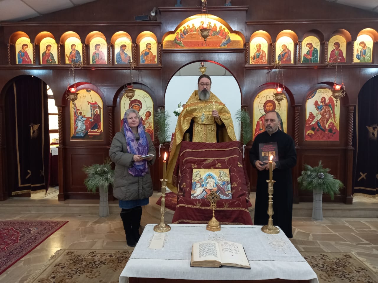 Затем архимандрит Филипп поздравил с наступающим Днём Ангела диакона Максима Сабаха и с прошедшим Днём рождения постоянную прихожанку и сотрудницу Подворья Марину Войцеховскую и подарил им памятные подарки.