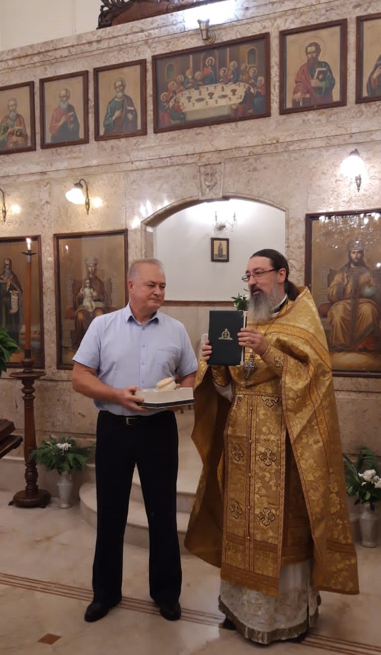 Затем настоятель Подворья сердечно приветствовал Чрезвычайного и Полномочного Посла Российской Федерации в Ливане Александра Николаевича Рудакова, поздравил его с наступающим Днём Тезоименитства, с Днём памяти св. блгв. Александра Невского, подарил ему памятные подарки и возгласил ему многолетие.