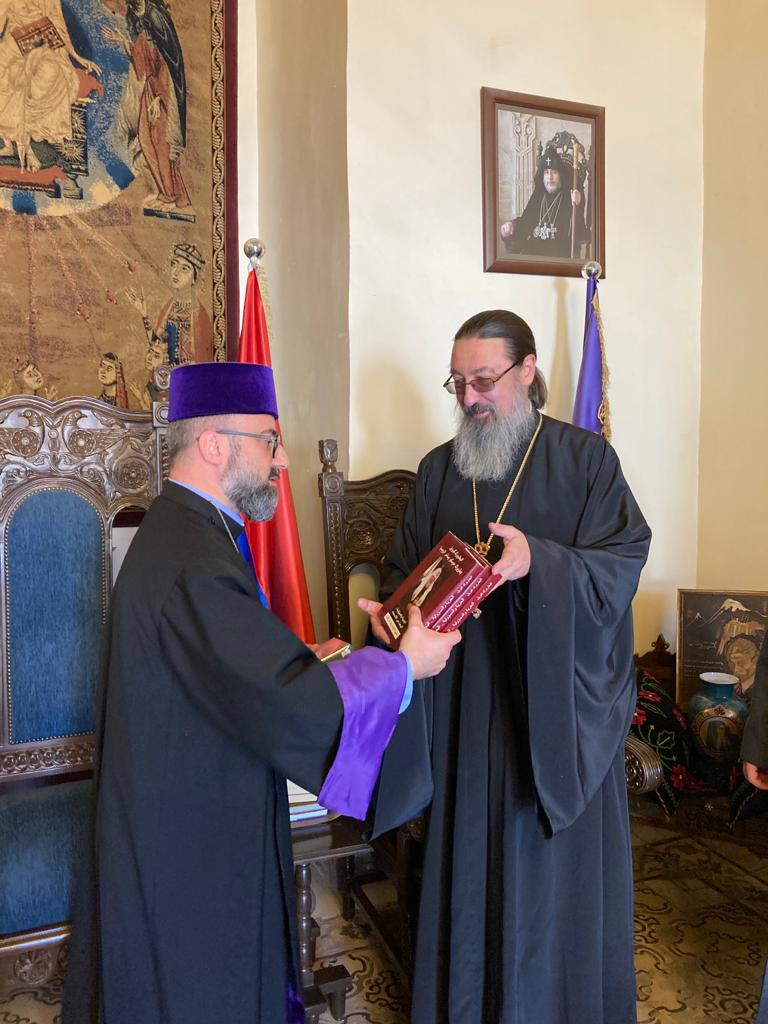 В завершении встречи архимандрит Филипп подарил епископу Армашу Налбандяну несколько комплектов книги Святейшего Патриарха Московского и всея Руси „Свобода и ответственность“ на арабском языке.