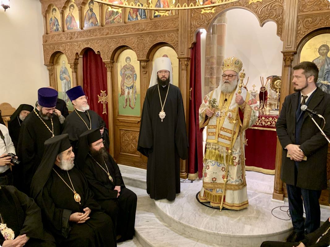 Затем высоких гостей приветствовал настоятель храма святого Георгия Победоносца протоиерей Даниил Наме, передав Блаженнейшему Патриарху Иоанну и митрополиту Волоколамскому Антонию памятные сувениры.