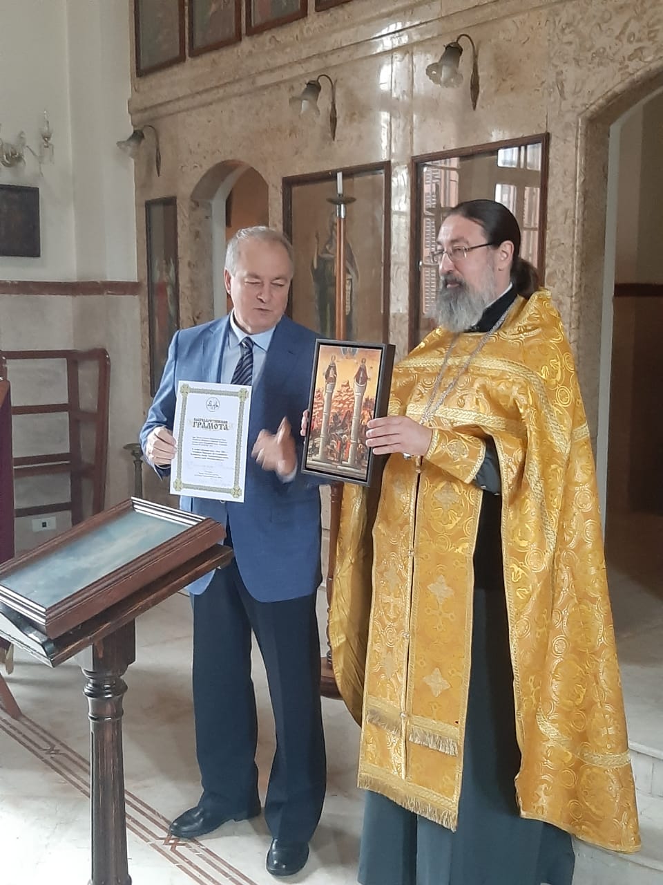 Затем архимандрит Филипп поздравил Чрезвычайного и Полномочного Посла Российской Федерации в Ливане с высокой наградой Русской Православной Церкви , орденом в честь святого и благоверного великого князя Александра Невского и вручил ему Благодарственную грамоту Подворья Русской Православной за помощь в организации визита в пределы Антиохийской Православной Церкви Председателя отдела внешних церковных связей Московского патриархата митрополита Волоколамского Антония.