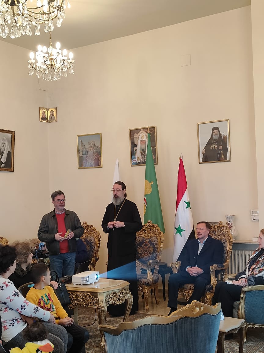 В презентации принял участие Чрезвычайный и Полномочный Посол Российской Федерации в Сирии Ефимов А.В., директор «Русского дома» в Дамаске Сухов Н.В., российские соотечественники, проживающие в Сирии и прибывшие в Дамаск для участия в Божественной литургии в храме святого священномученика Игнатия Богоносца.