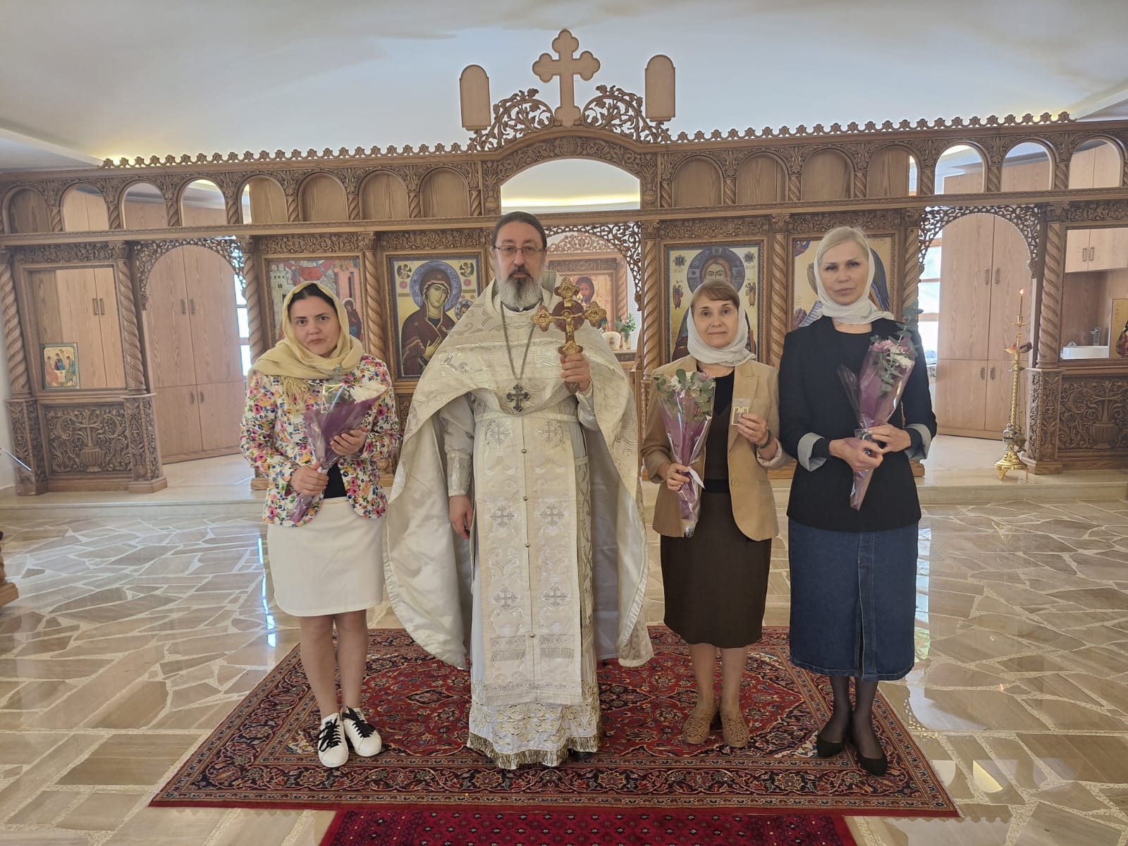 В конце богослужения архимандрит Филипп поздравил с Днём Тезоименитства сотрудников Подворья Светлану Ариди, Светлану Бахмат и Светлану Карпушкину, вручил им памятные подарки и возгласил многолетие.