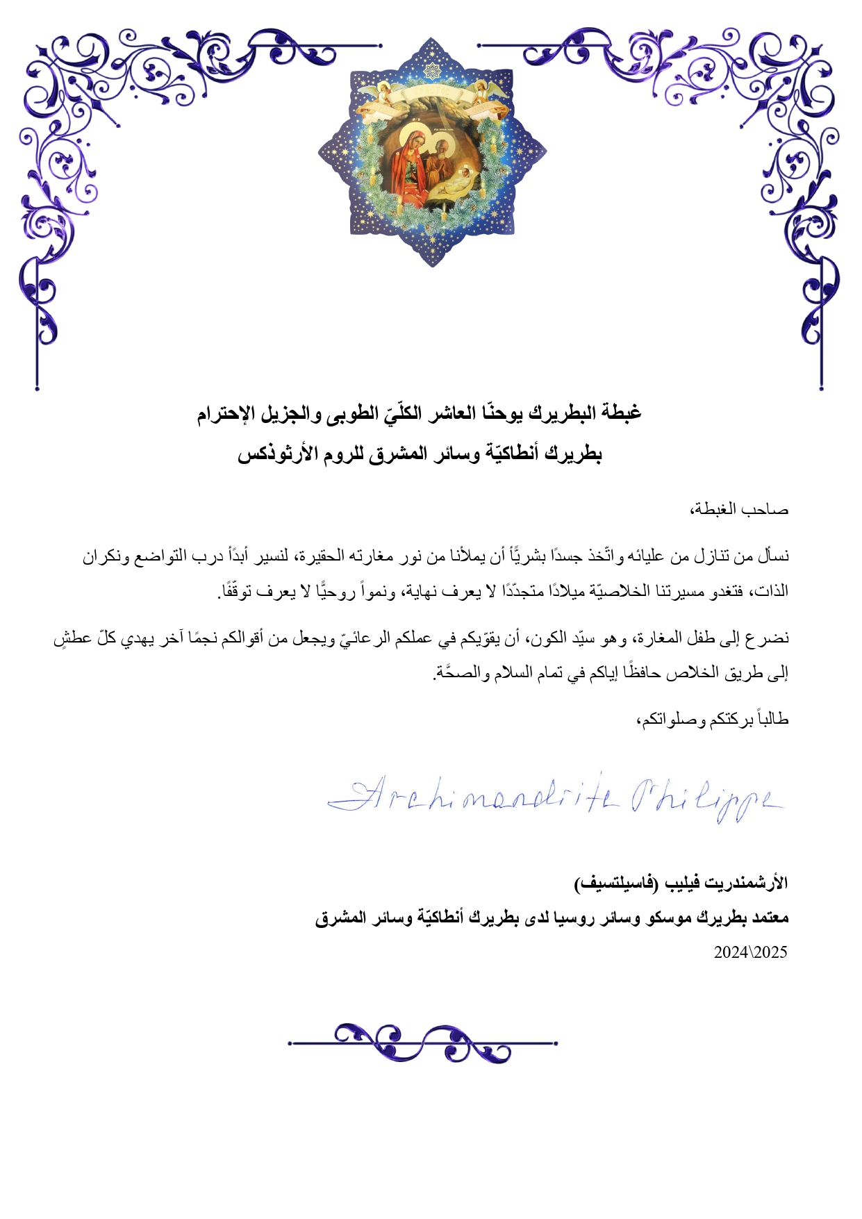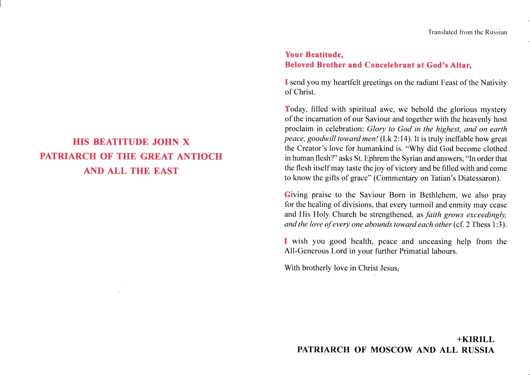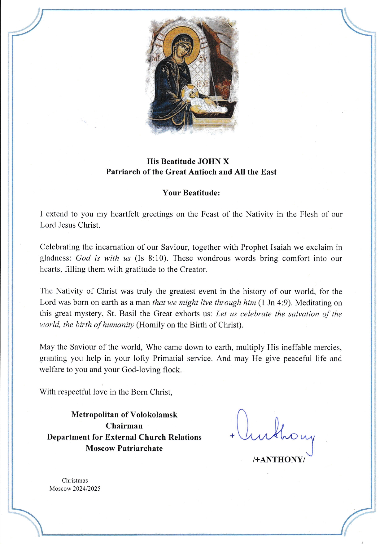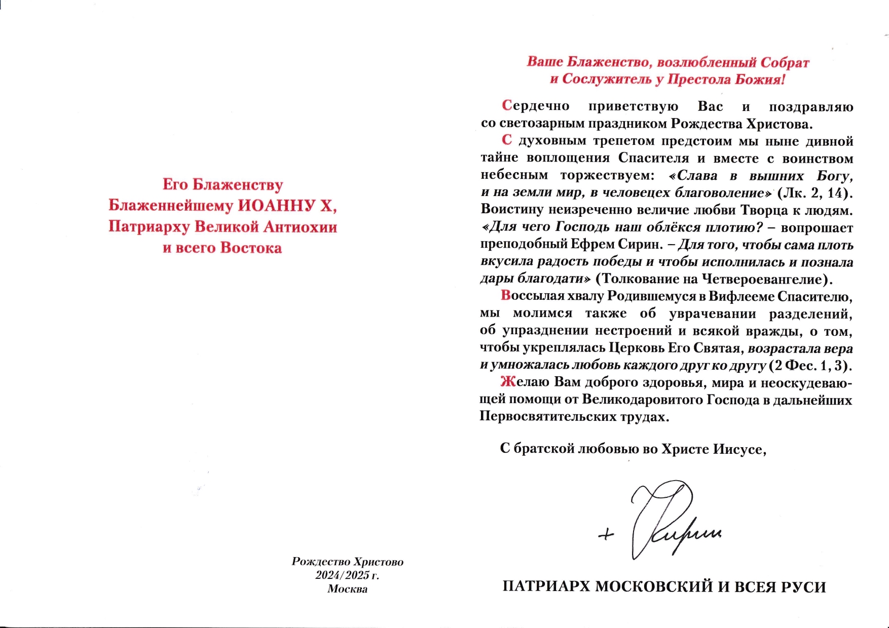 Рождественские поздравления главе Антиохийской Православной Церкви