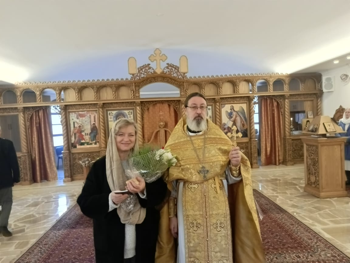 Затем настоятель поздравил с прошедшим днем рождения и наступающим днем Ангела постоянную прихожанку Подворья Евгению Иващенко Эль - Вакиль, преподнёс ей памятные подарки и возгласил многолетие.