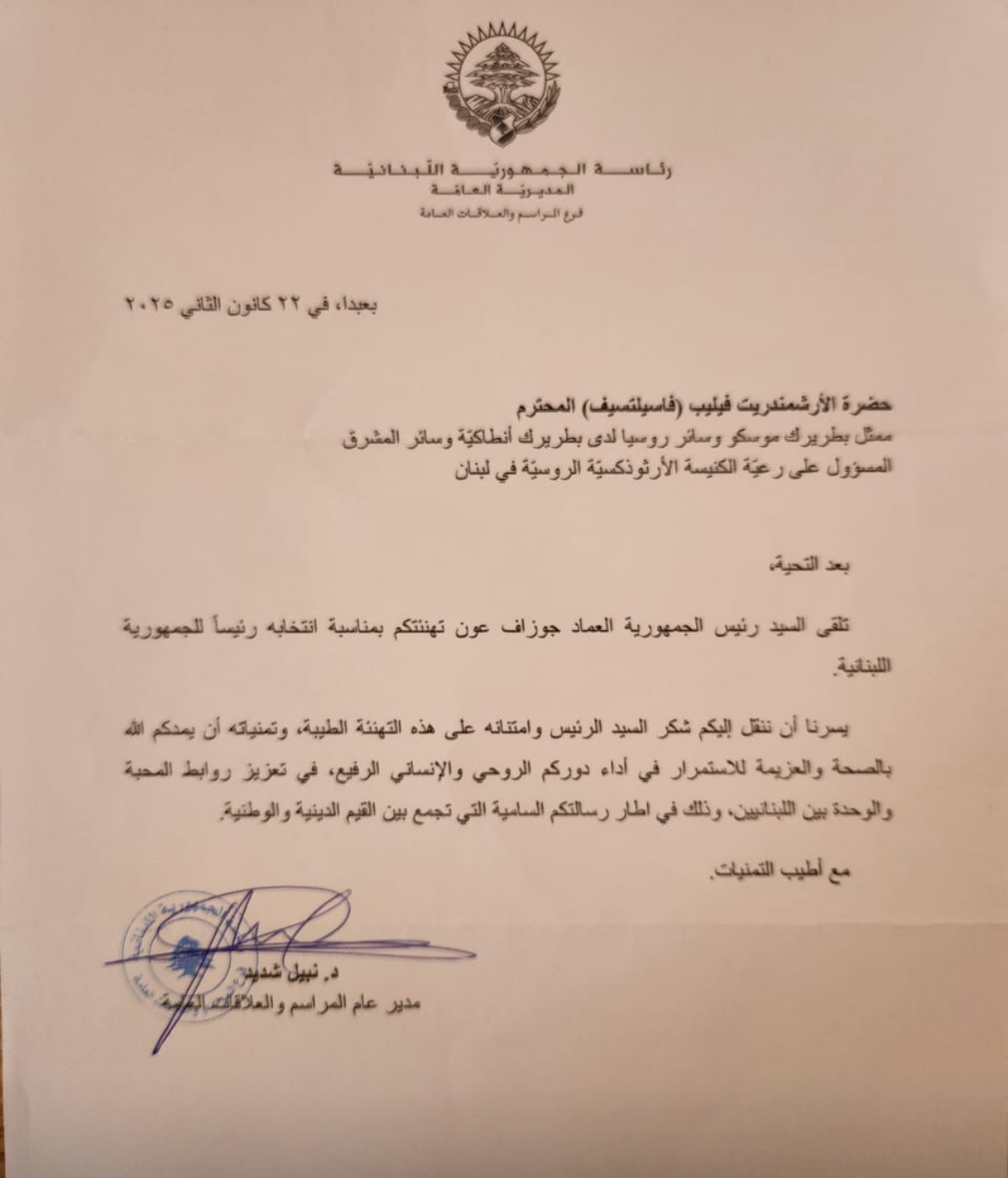 после теплого приветствия сообщаю Вам, что господин Президент Республики Генерал Джозеф Аун получил Ваши поздравления по случаю его избрания на должность Президента Ливанской Республики.