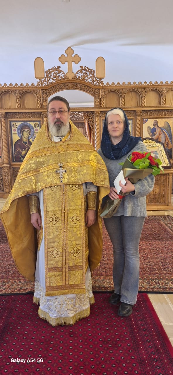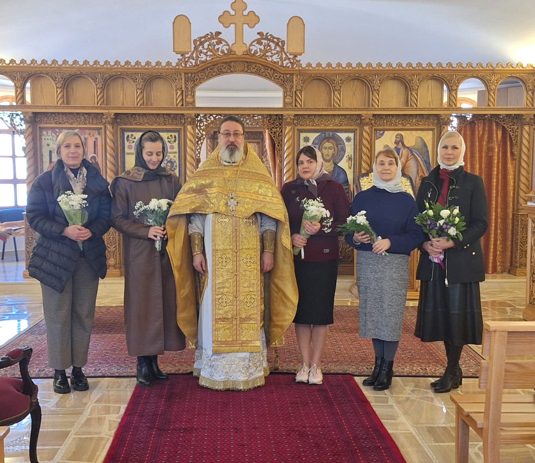 Затем настоятель поздравил с днём рожденья регента Екатерину Баранову, с днем Ангела казначея Светлану Ариди и постоянных прихожанок Подворья Светлану Азар, Светлану Ганем и Светлану Капустину, вручил им памятные подарки и возгласил многолетие.