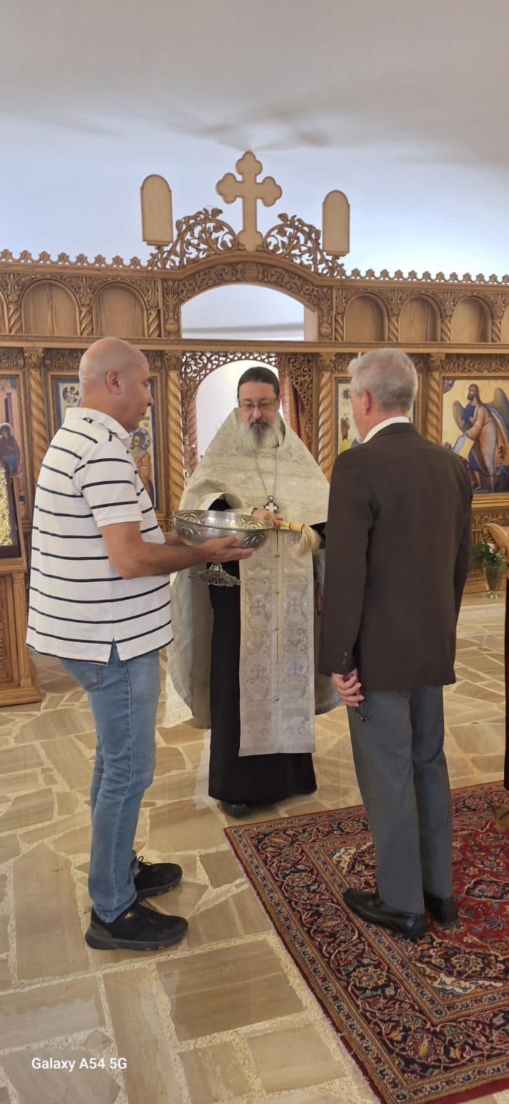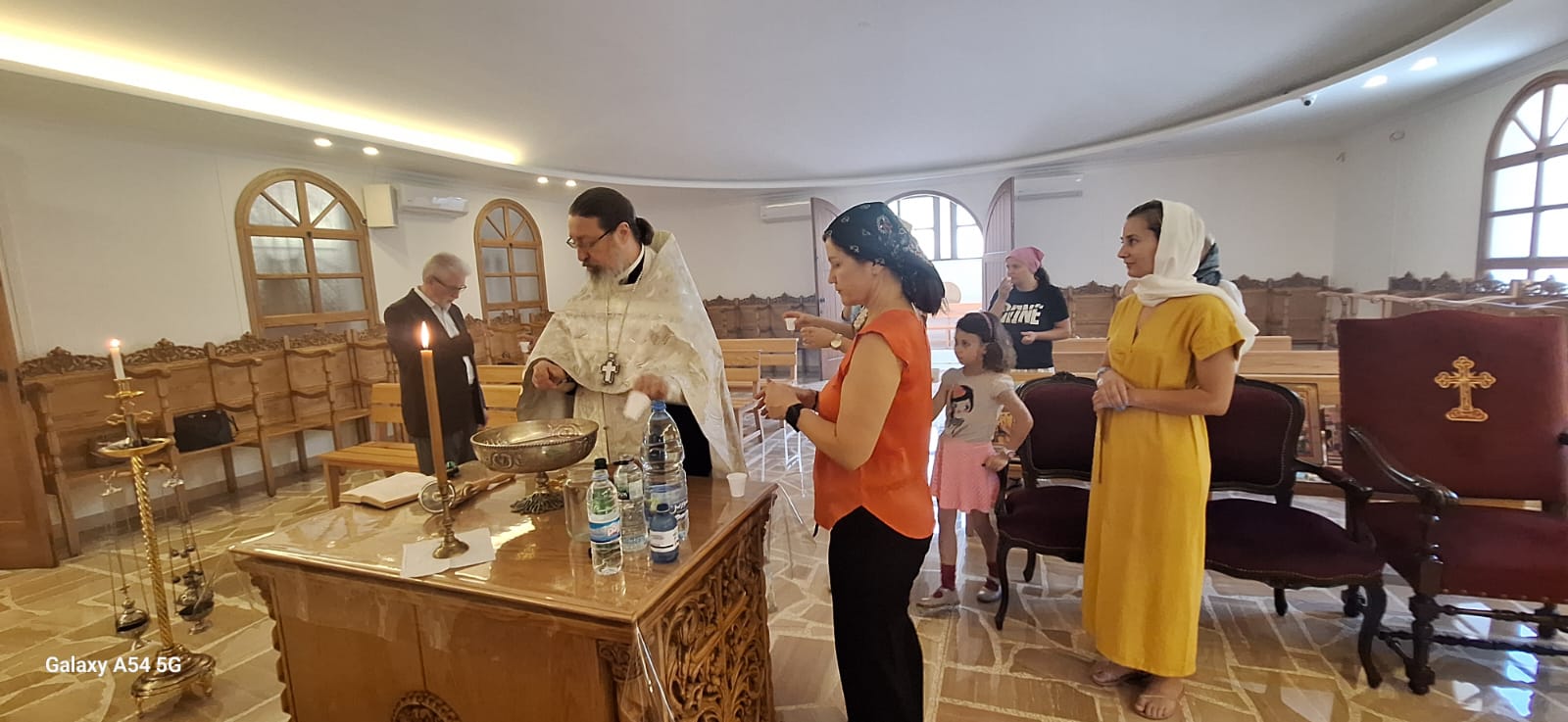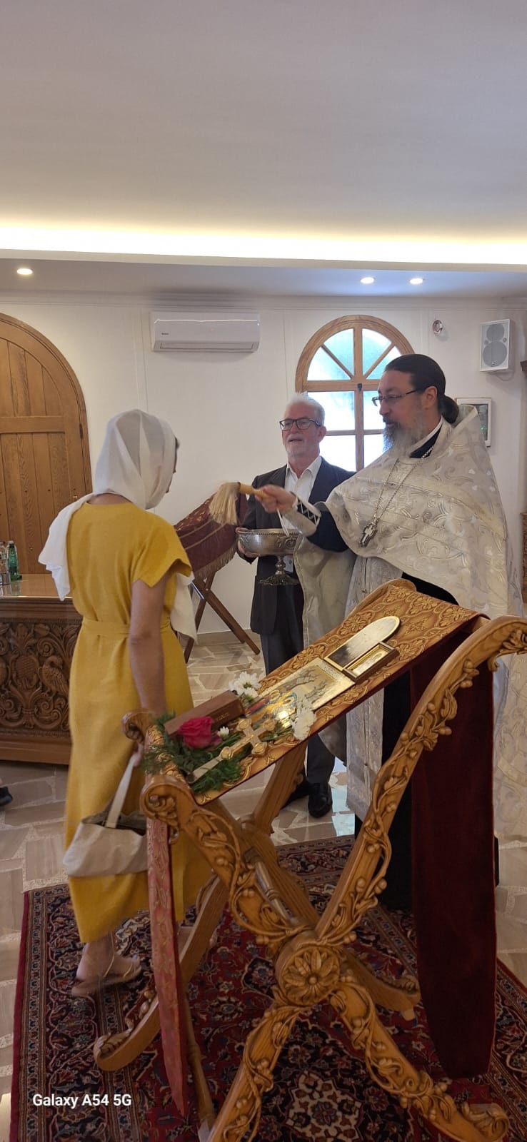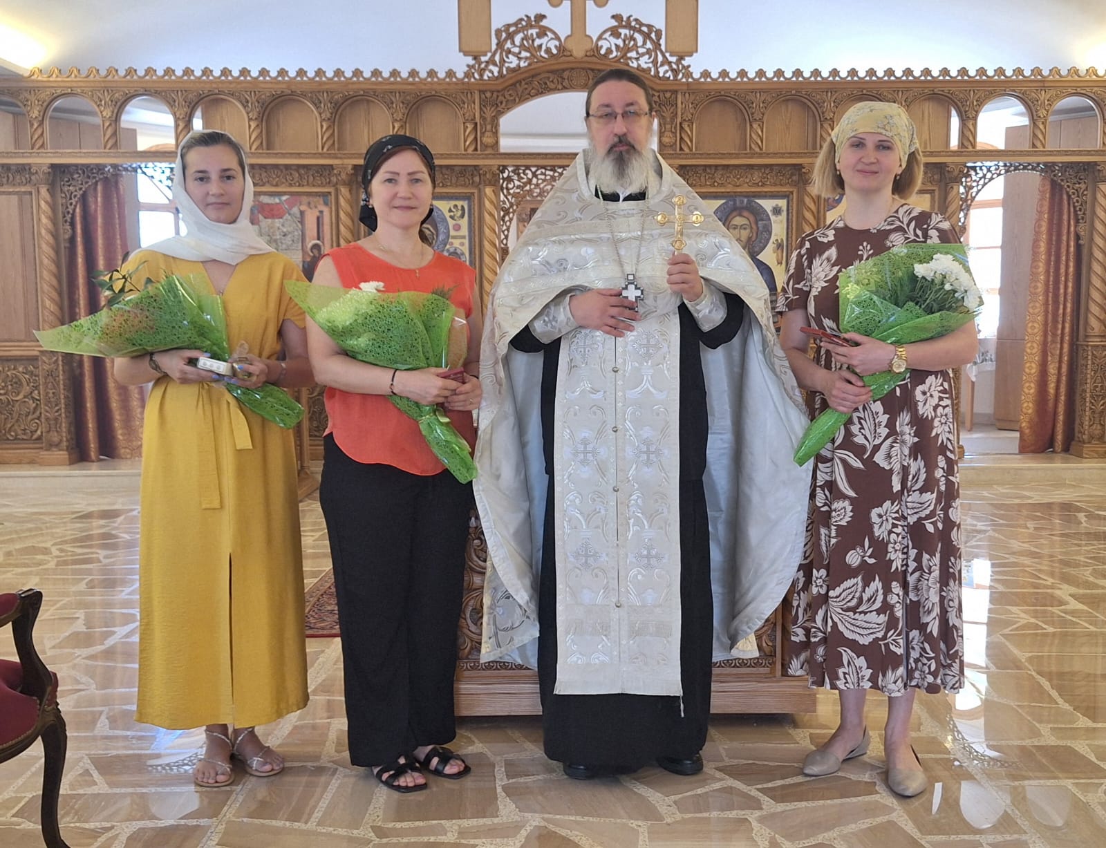 Затем настоятель поздравил с днём Ангела и прошедшим днем рождения постоянных прихожанок и сотрудниц Подворья Юлию Козлову, Юлию Массоуд и Светлану Азар, вручил им памятные подарки и возгласил многолетие.