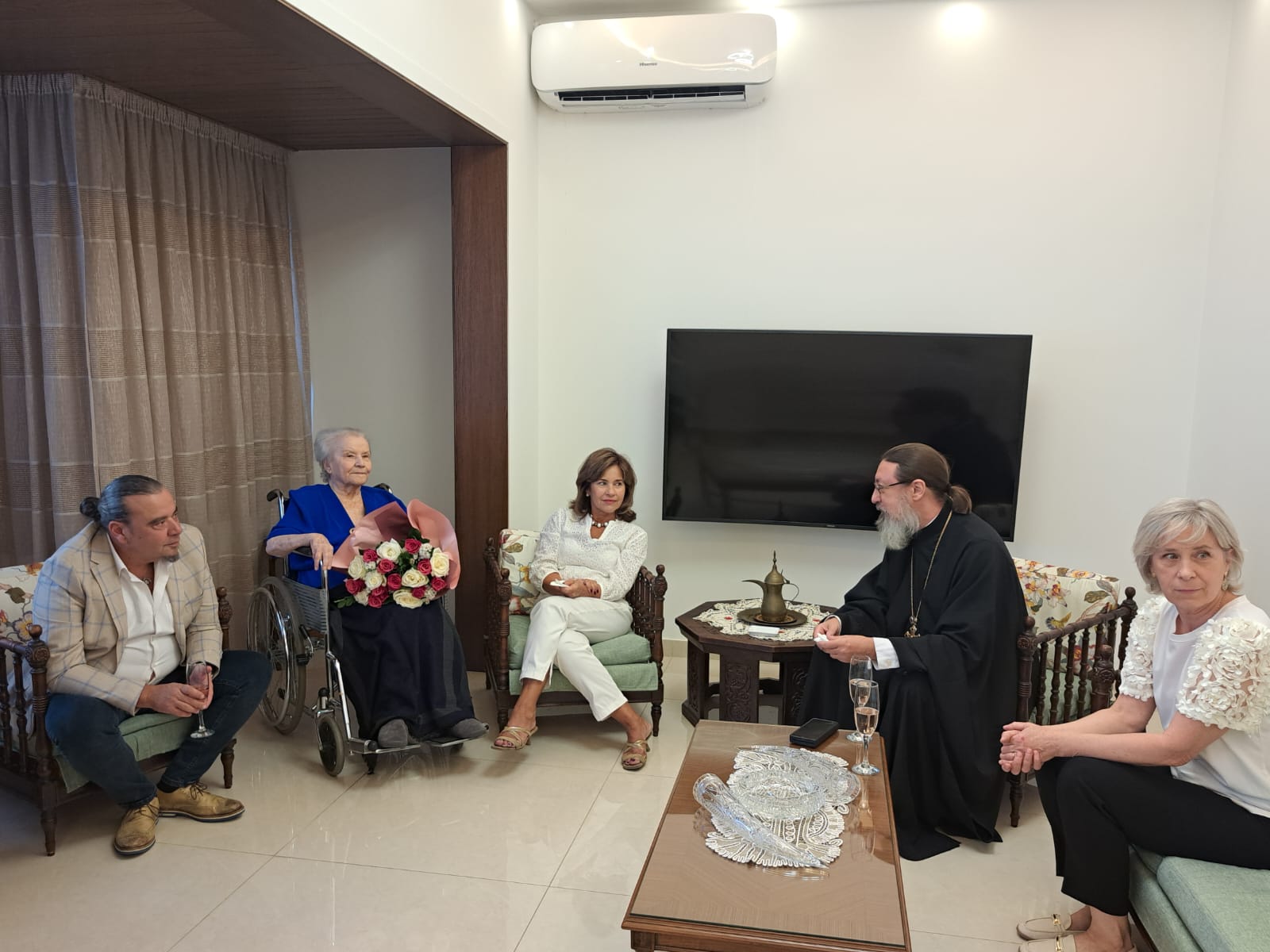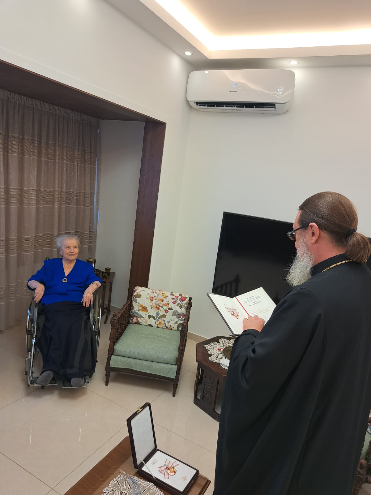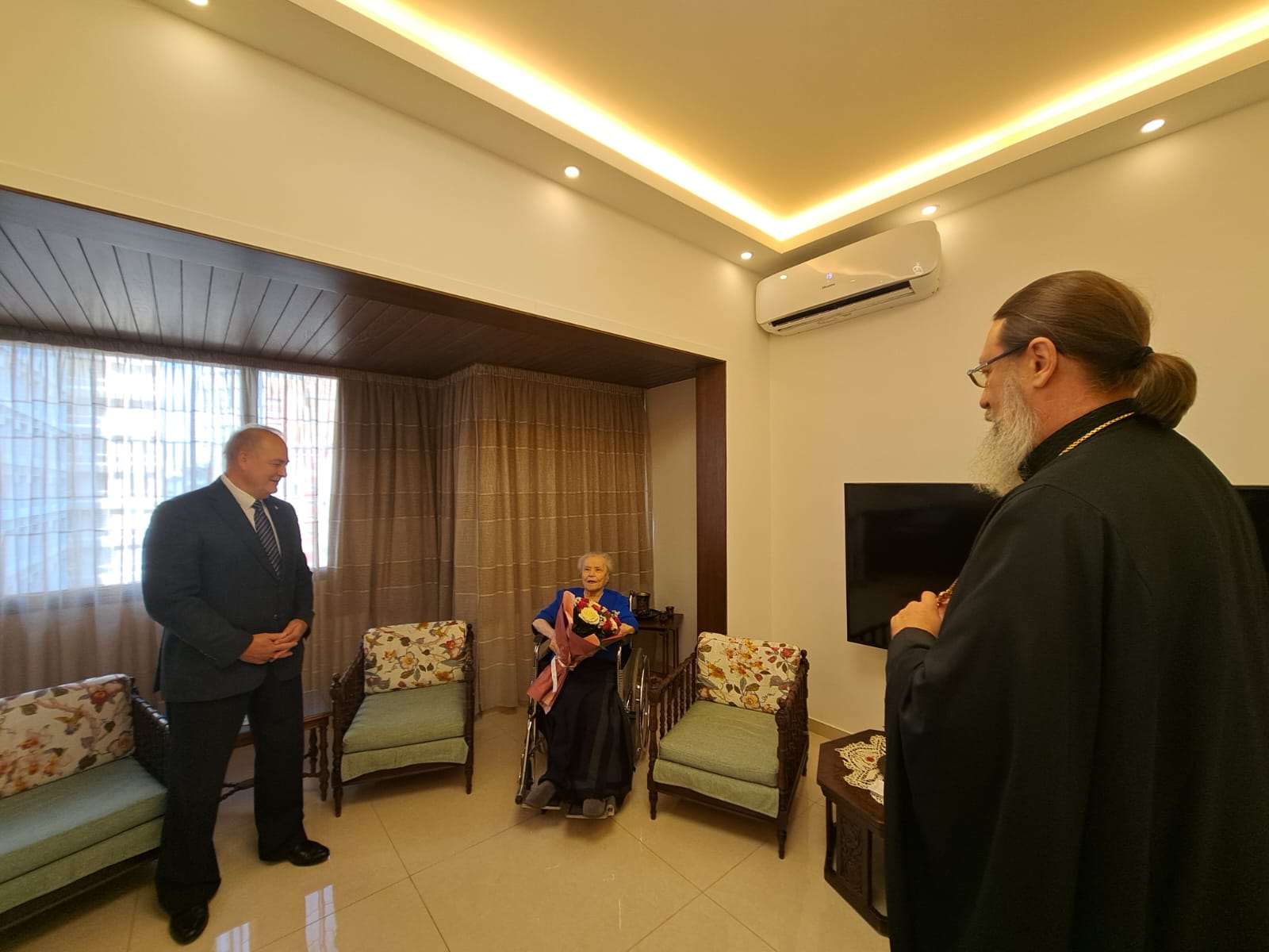В субботу, 27 сентября, в день Великого двунадесятого праздника Воздвижения Честного и Животворящего Креста Господня архимандрит Филипп посетил старейшую прихожанку Подворья Веру Никитичну Ганем и вручил ей орден Русской Православной Церкви в честь преподобной Евфросинии, великой княгини Московской III степени, которым её наградил Святейший Патриарх Московский и всея Руси Кирилл в связи с 90- летием со дня рождения и многолетние труды на Подворье Русской Православной Церкви в Бейруте.