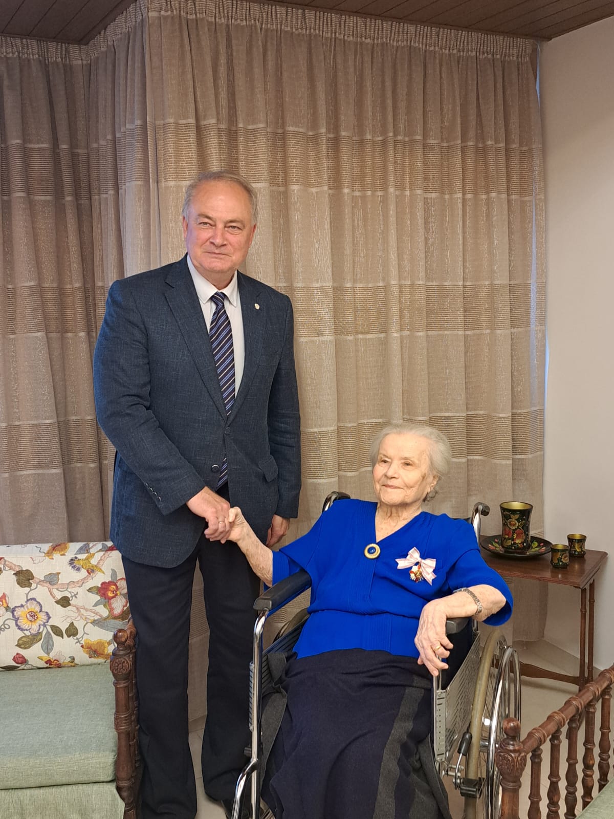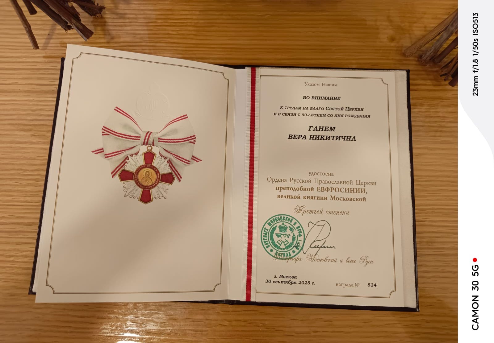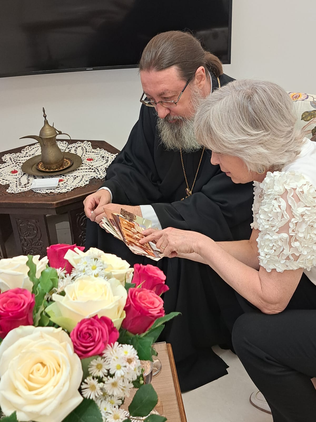 В субботу, 27 сентября, в день Великого двунадесятого праздника Воздвижения Честного и Животворящего Креста Господня архимандрит Филипп посетил старейшую прихожанку Подворья Веру Никитичну Ганем и вручил ей орден Русской Православной Церкви в честь преподобной Евфросинии, великой княгини Московской III степени, которым её наградил Святейший Патриарх Московский и всея Руси Кирилл в связи с 90- летием со дня рождения и многолетние труды на Подворье Русской Православной Церкви в Бейруте.