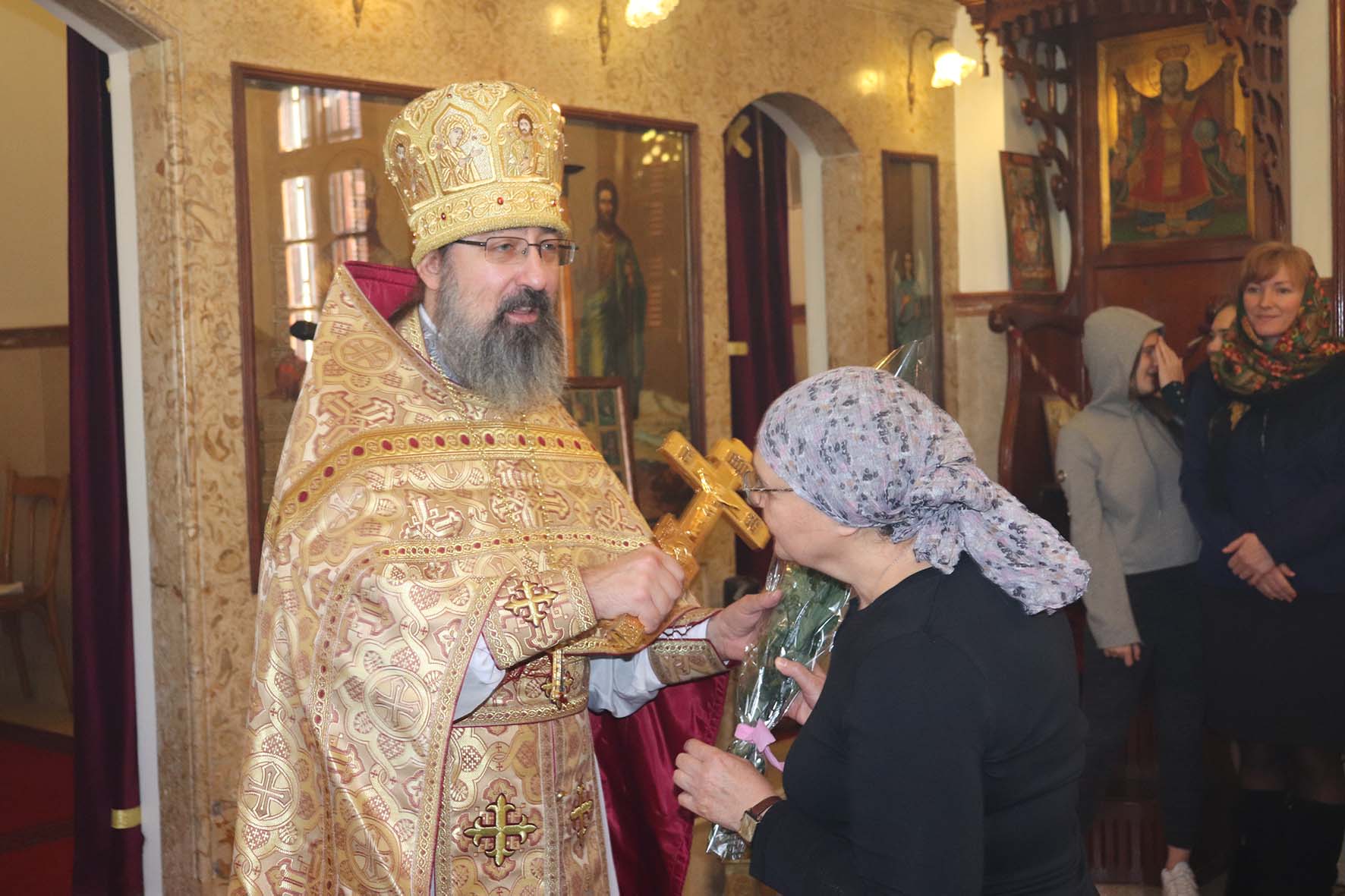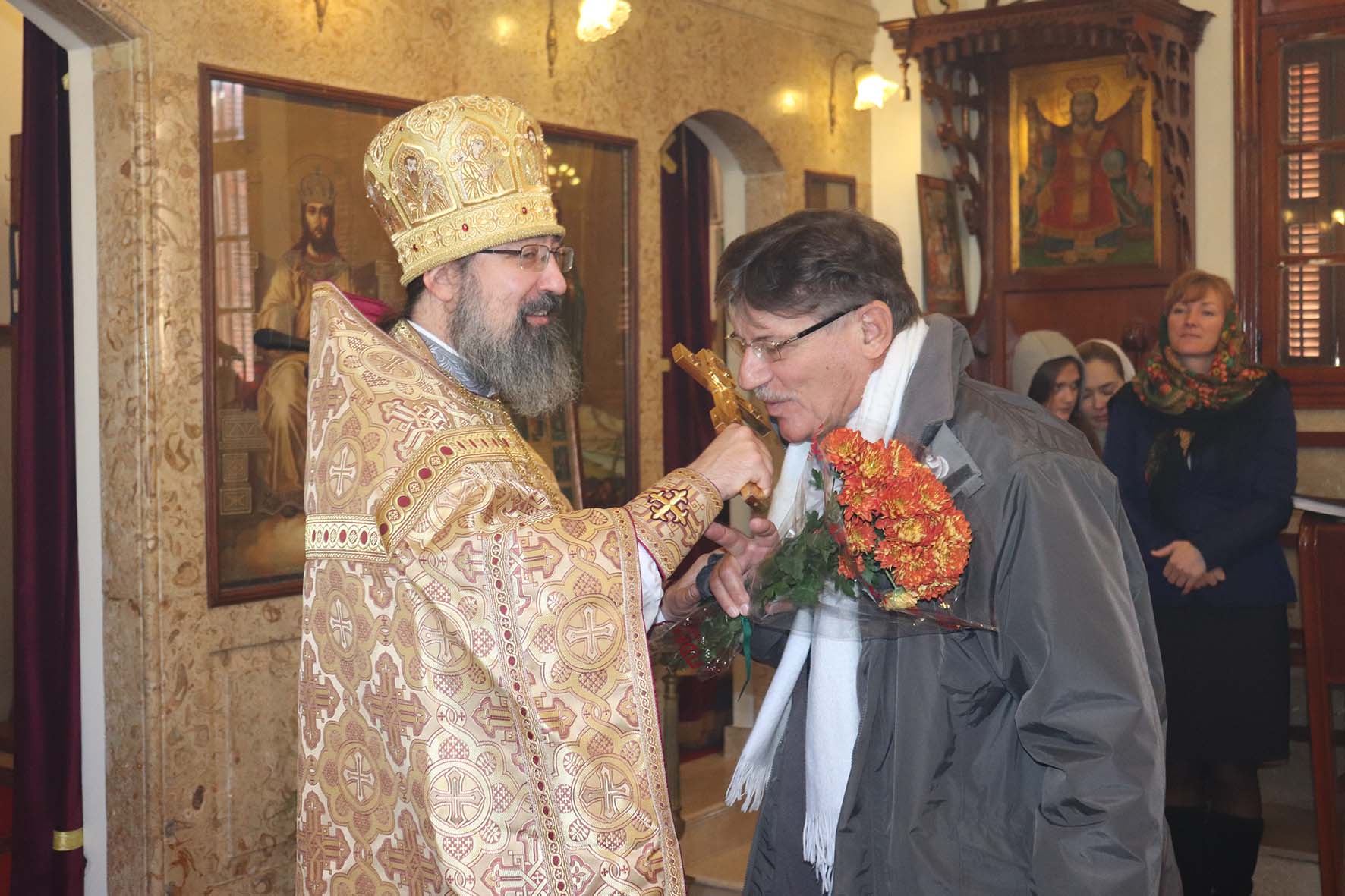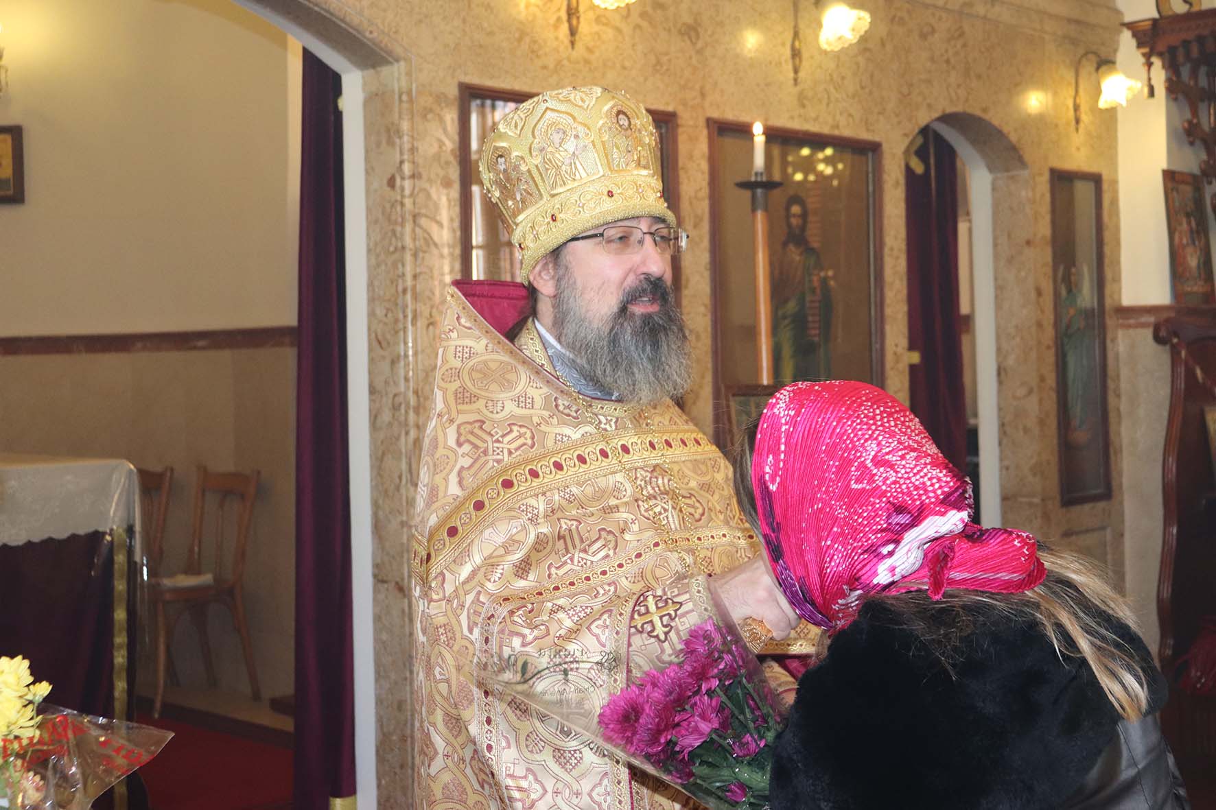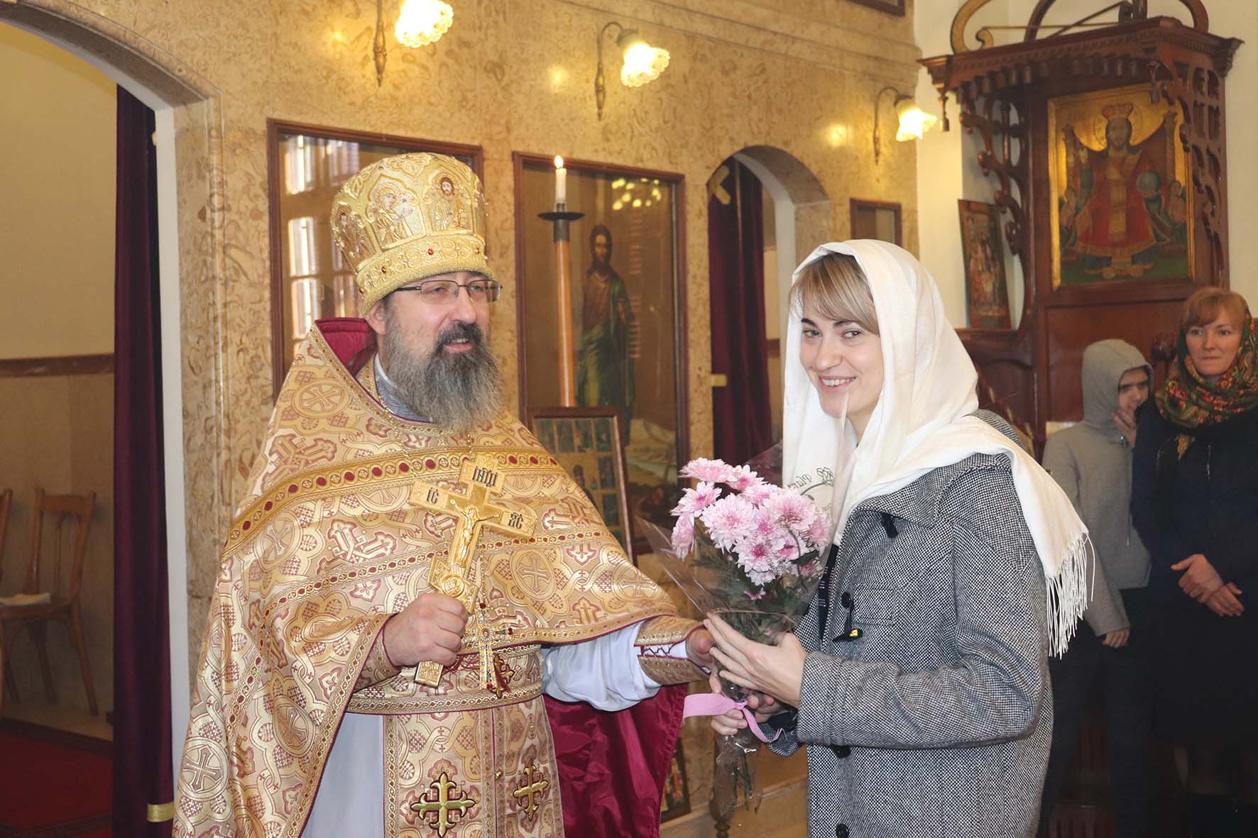 После отпуста Божественной литургии архимандрит Филипп поздравил прихожан, праздновавших на прошедшей седьмице день Ангела, подарил им по букету цветов и провозгласил многолетие.