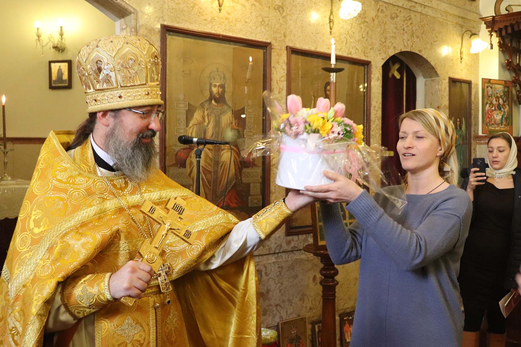 После отпуста Божественной литургии настоятель поздравил с Днём рождения пономаря Ришара Хаддад и регента Подворья Екатерину Баранову и преподнес им подарки.