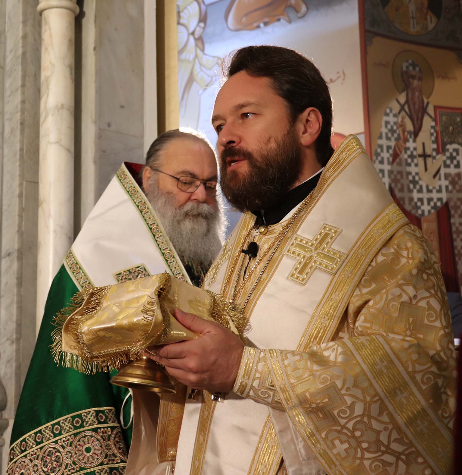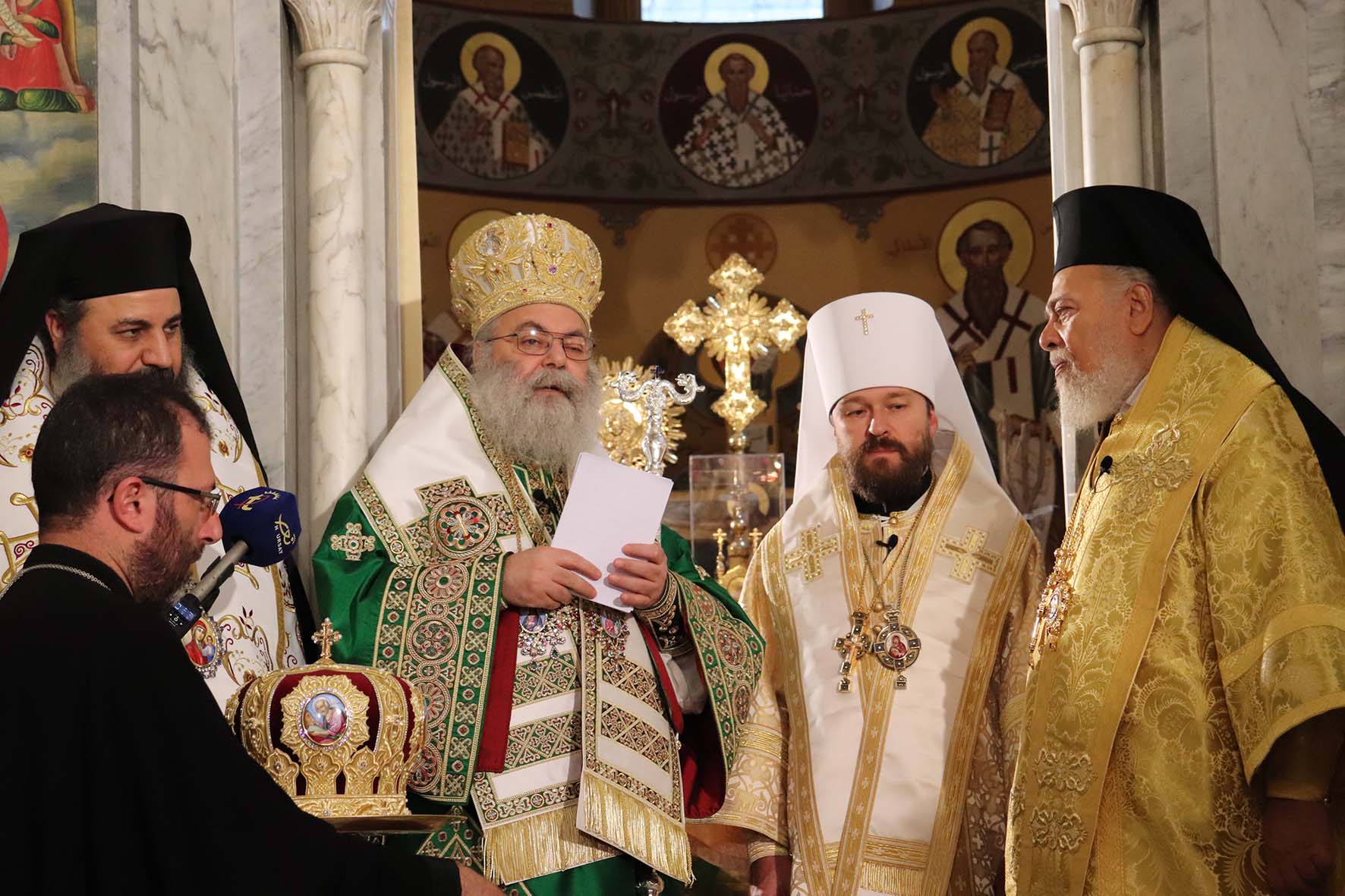 Его Блаженство также сердечно приветствовал председателя Отдела внешних церковных связей Московского Патриархата митрополита Волоколамского Илариона, который по благословению Патриарха Московского и всея Руси принял участие в торжествах в Захле.
