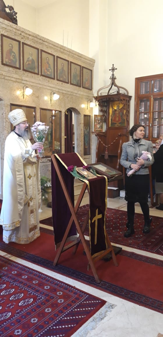 После отпуста Божественной литургии настоятель Подворья поздравил с прошедшим Днём рождения постоянных прихожан Юлию Городнянскую, Нидаль Хаддат и Ксению Роммаль и подарил им по букету цветов.