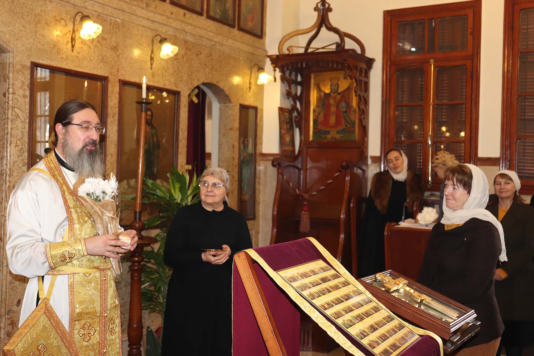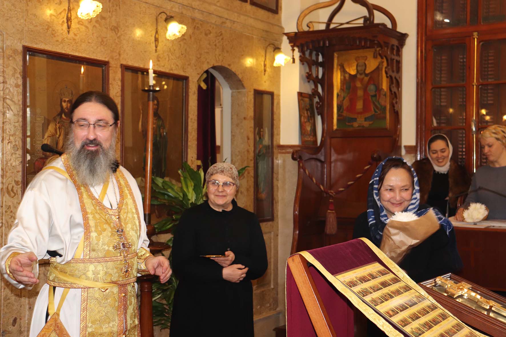 После окончания богослужения архимандрит Филипп поздравил с прошедшим Днём рождения сотрудников Подворья регента Е. Баранову, Т. Раммаль, Е. Фарах и Л. Аун, вручил им памятные подарки и провозгласил многолетие.