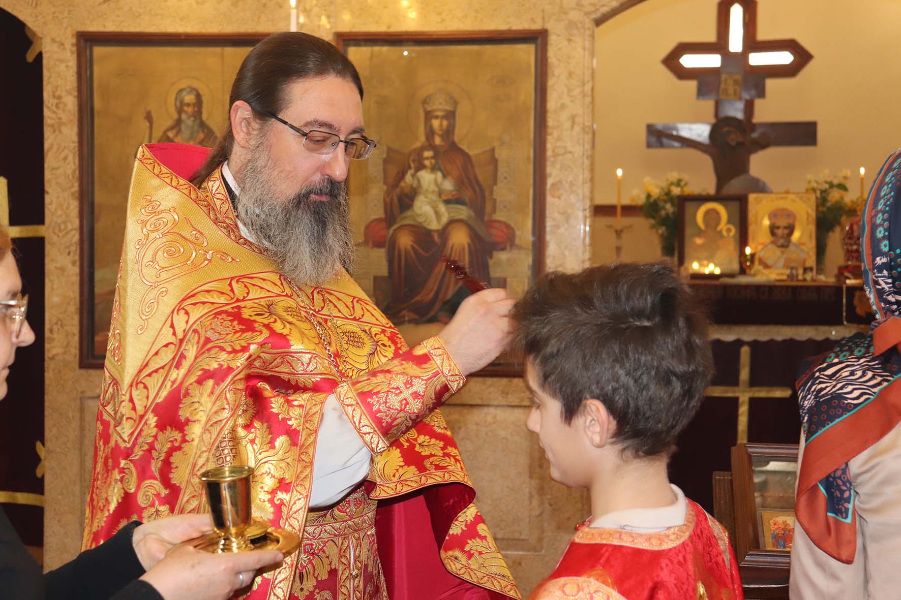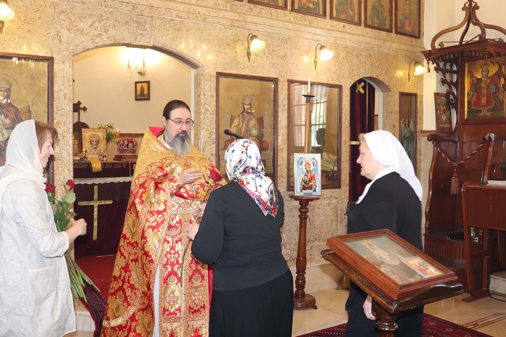 После отпуста Божественной литургии по сложившейся традиции настоятель поздравил прихожанок Подворья с Днём жен-мироносиц и подарил каждой красную розу. Также архимандрит Филипп поздравил с прошедшим Днём Тезоименитства постоянную прихожанку Подворья Ирину Зеленину.