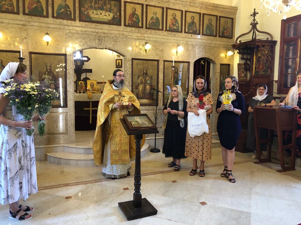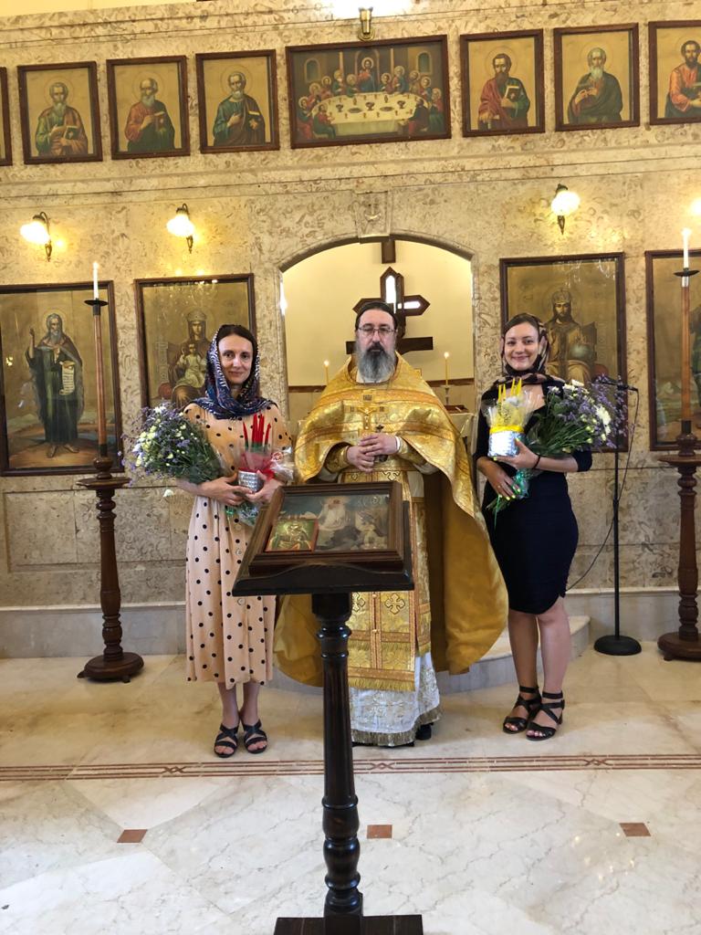 Затем архимандрит Филипп поздравил с днём Тезоименитства прихожанок и сотрудниц Подворья Ольгу Мбаед и Ольгу Ометову и подарил им памятные подарки.