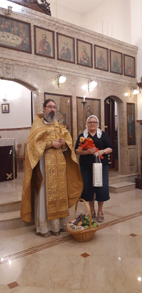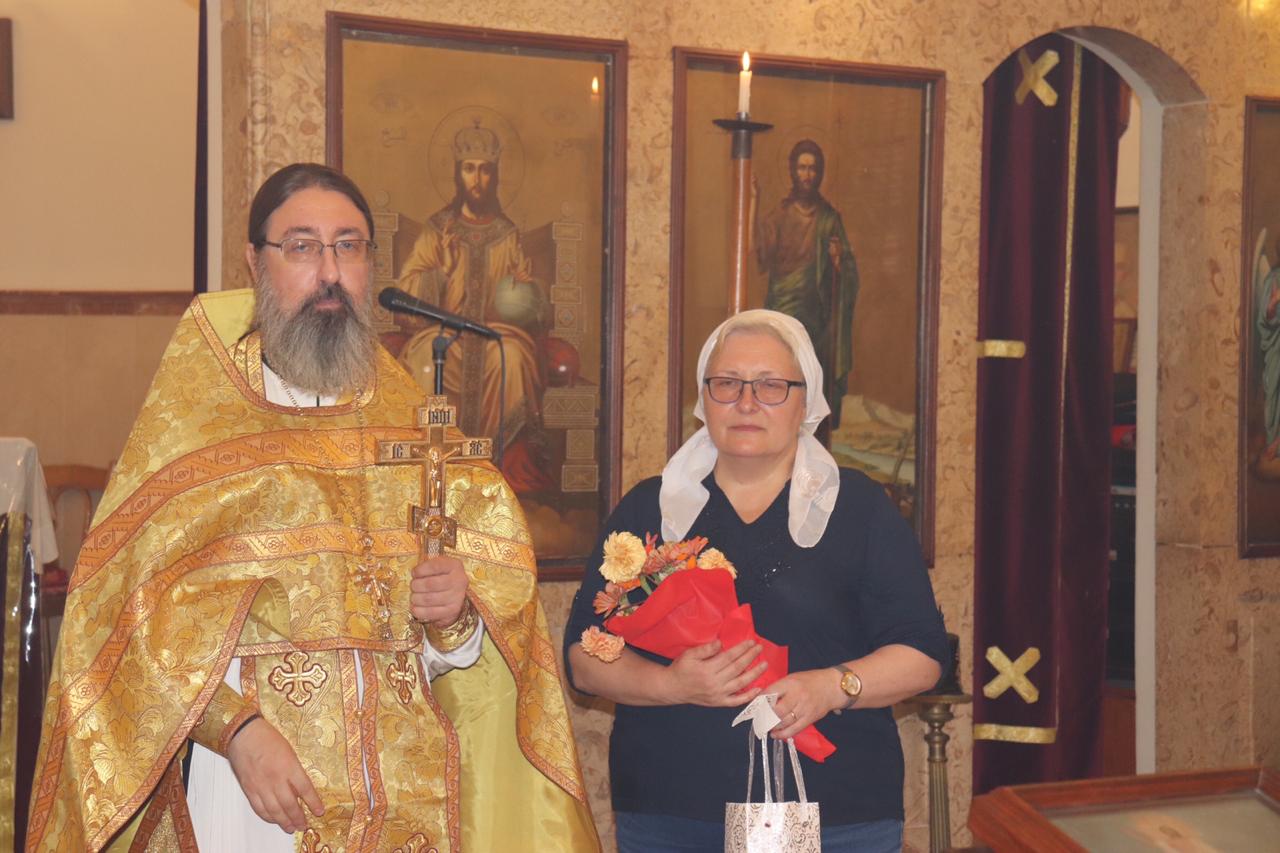 Затем настоятель поздравил с прошедшим днём рождения уставщика хора Подворья Марину Сергеевну Ктейш, подарил ей букет цветов, памятные подарки и возгласил многолетие.