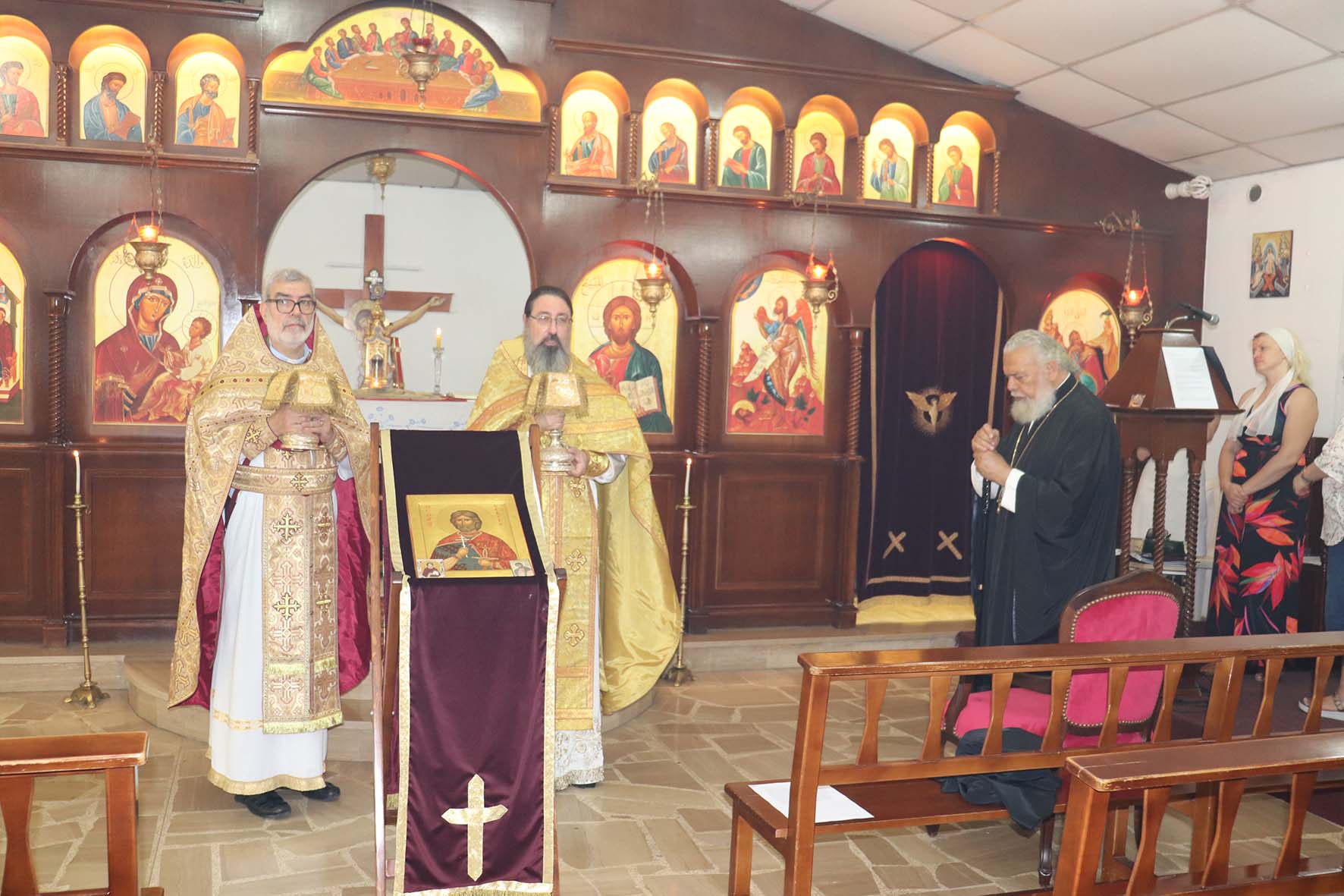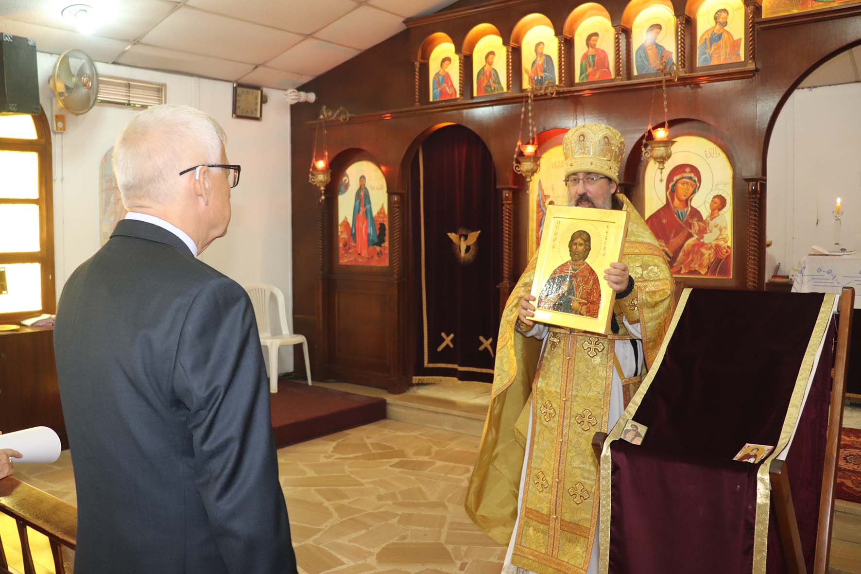 Настоятель преподнес в дар господину Послу освященную икону св. блгв. князя Александра Невского, писаную прихожанкой Подворья Аидой (Анной) Сааде.