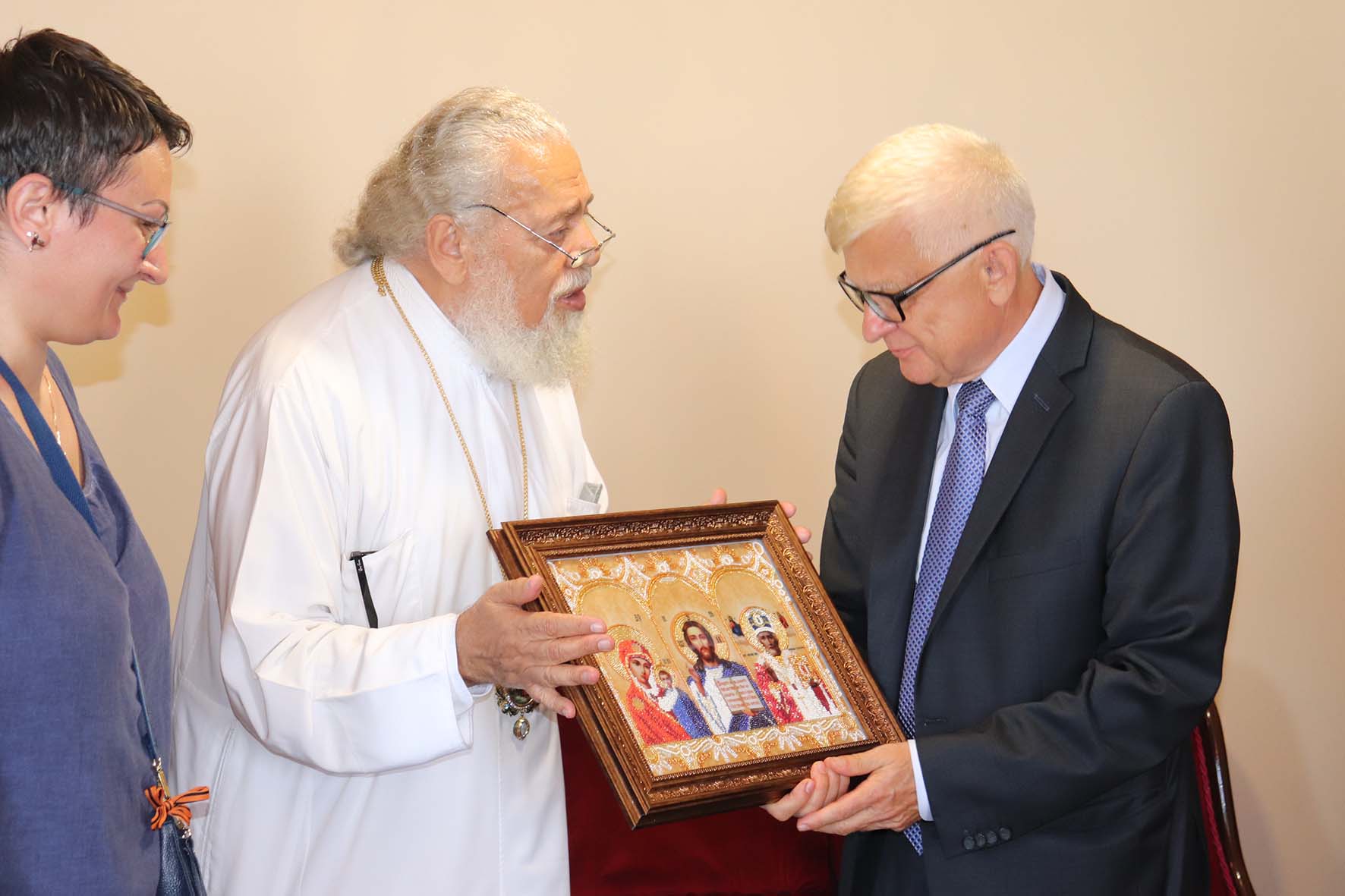 Владыка Нифон подарил А.С. Засыпкину икону, вышитую прихожанкой Подворья Анной Колесник.