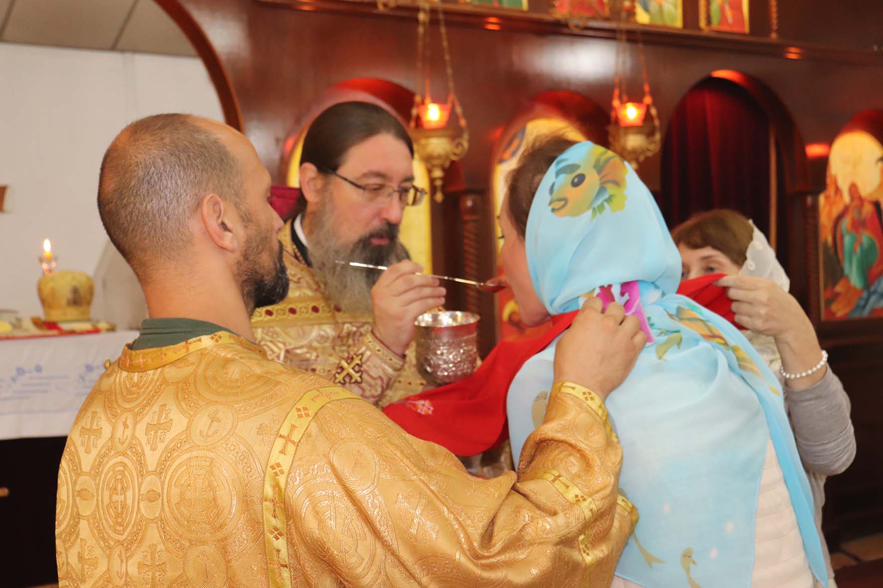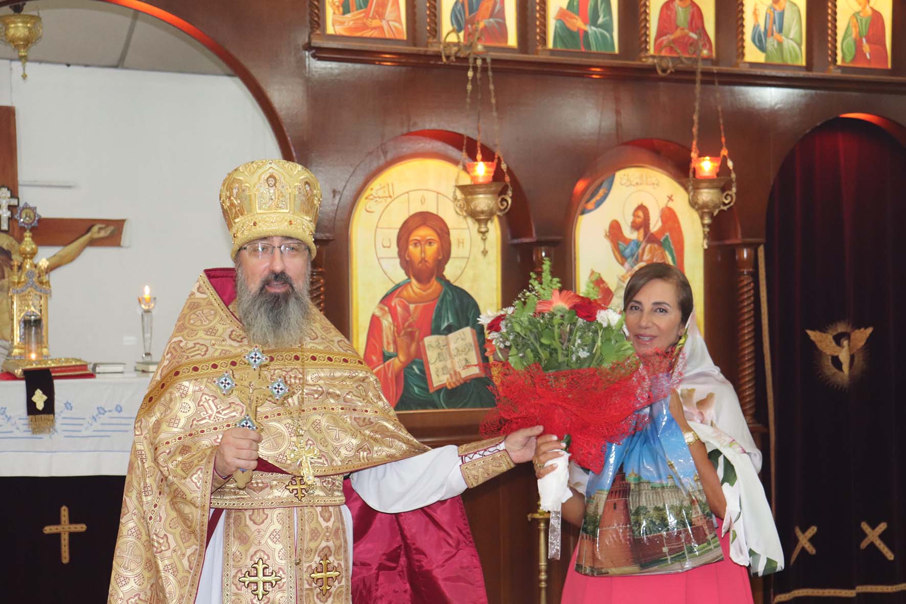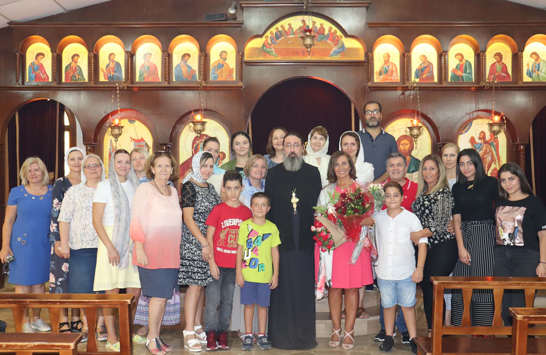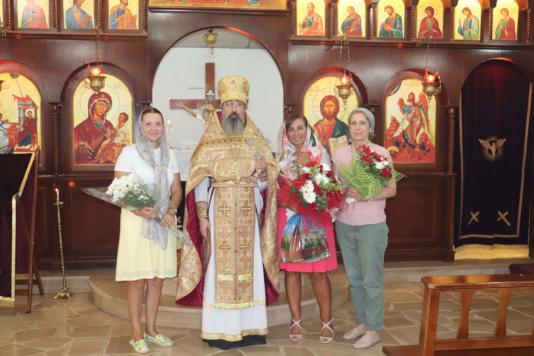 Затем настоятель поздравил с днём рождения Мариам-Майю, Светлану Ганем и Наталью Салем с прошедшим Днём ангела, подарил им букеты цветов, памятные подарки и возгласил многолетие.