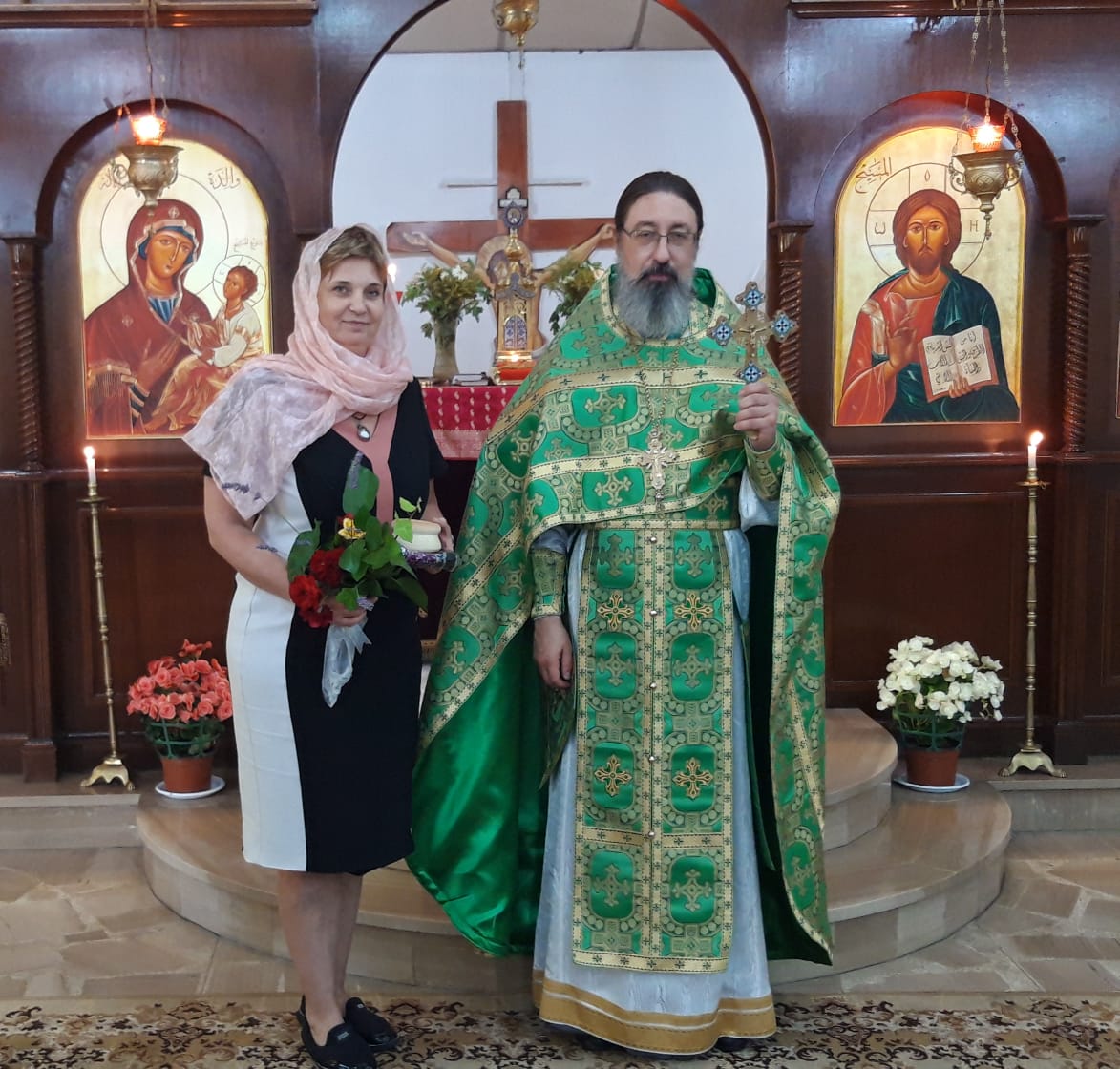 Затем настоятель поздравил с прошедшим Днём рождения постоянную прихожанку и сотрудницу Подворья Наталью Семаан, вручил ей богослужебную просфору, памятные подарки и возгласил многолетие.