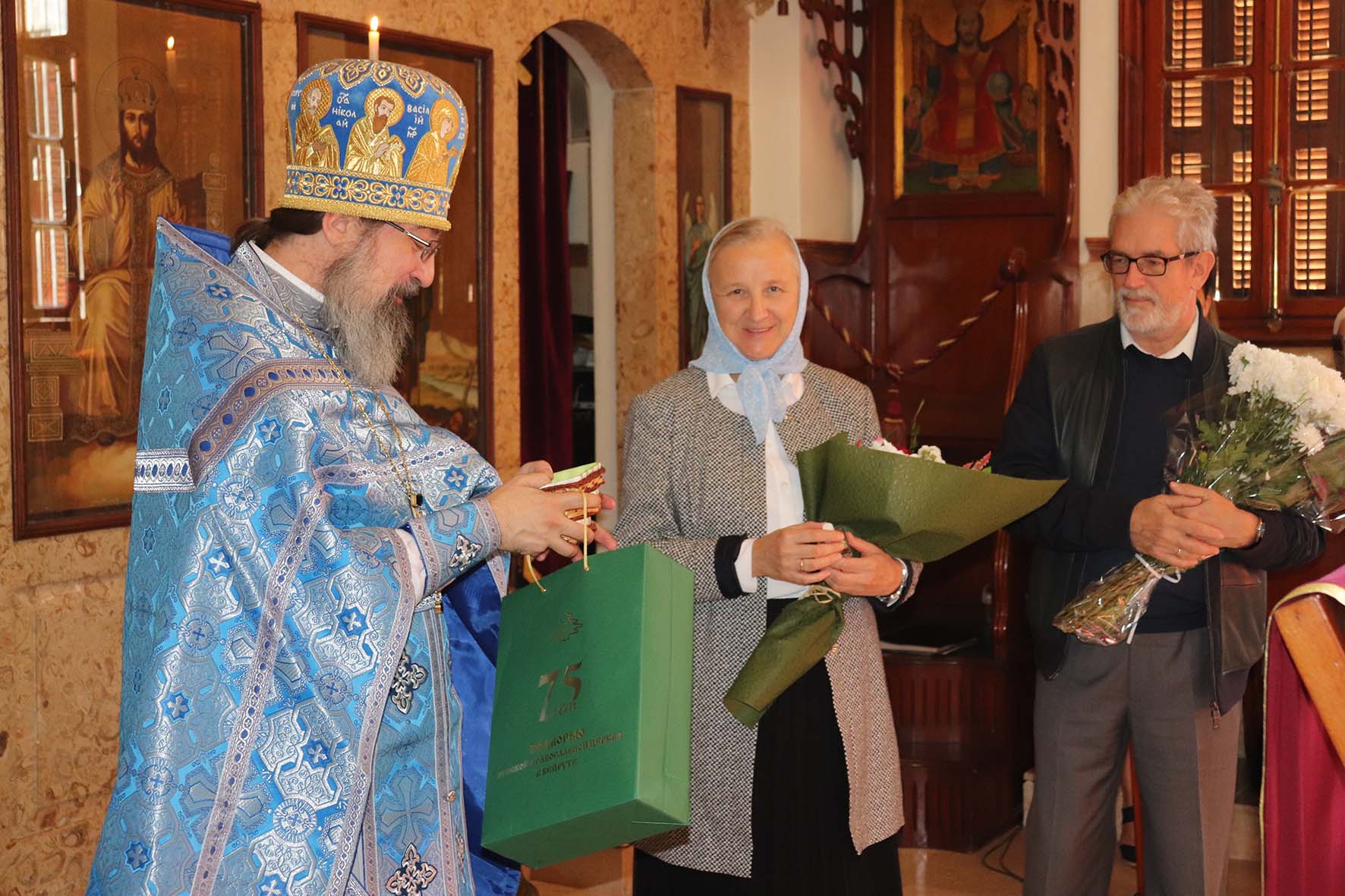 Затем настоятель Подворья поздравил с днём рождением и прошедшим днём Ангела Ирину и Димитрия Зелениных и вручил им памятные подарки.