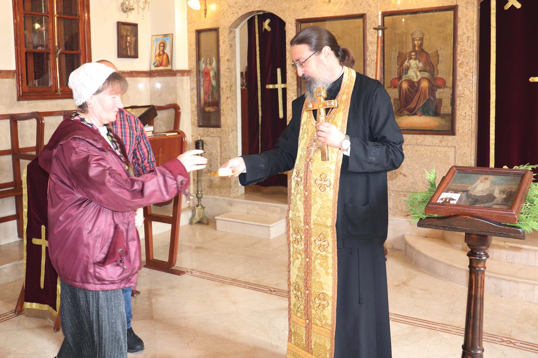 После отпуста Божественной литургии архимандрит Филипп поздравил с прошедшим Днем рождения постоянную прихожанку Подворья Людмилу Гасан и вручил ей памятные подарки.