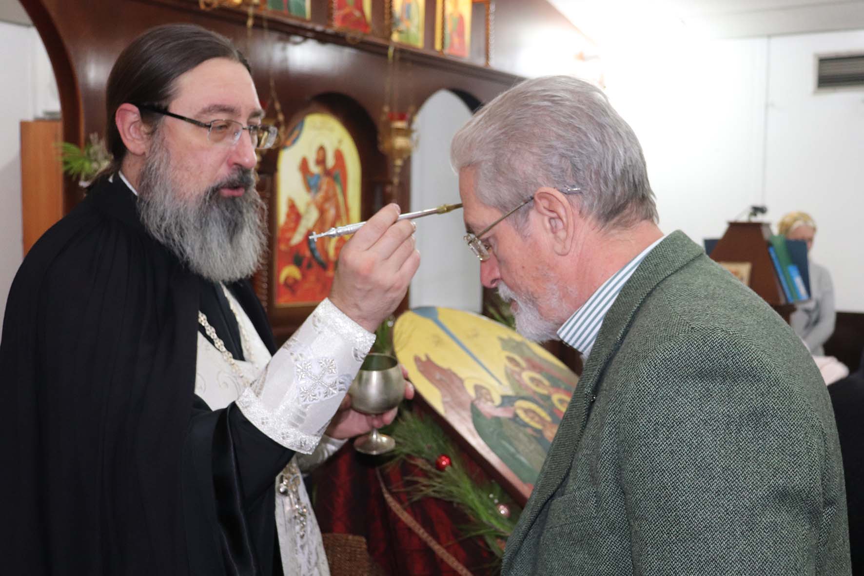 В конце богослужения настоятель Подворья помазал прихожан освящённым елеем.