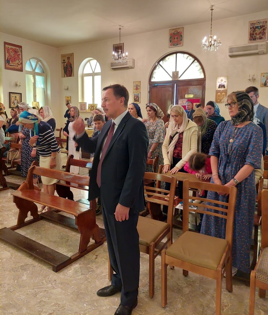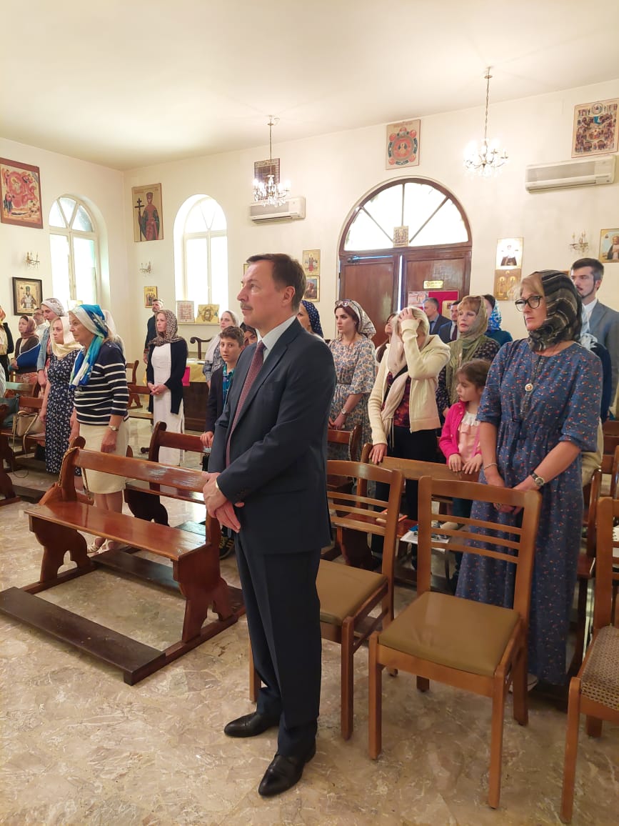 За богослужением молились Чрезвычайный и Полномочный посол Российской Федерации в Сирийской Арабской Республике Александр Владимирович Ефимов, сотрудники посольства Российской Федерации и многочисленные паломники из различных городов Сирии и Ливана.