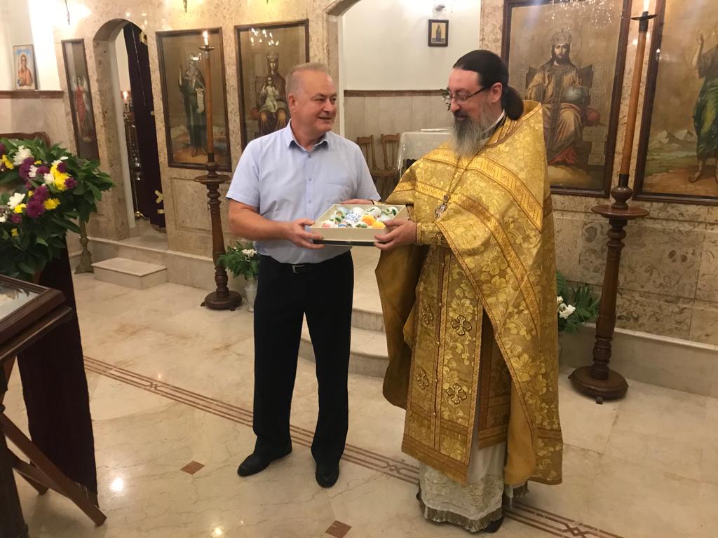 Затем настоятель Подворья сердечно приветствовал Чрезвычайного и Полномочного Посла Российской Федерации в Ливане Александра Николаевича Рудакова, поздравил его с наступающим Днём Тезоименитства, с Днём памяти св. блгв. Александра Невского, подарил ему памятные подарки и возгласил ему многолетие.