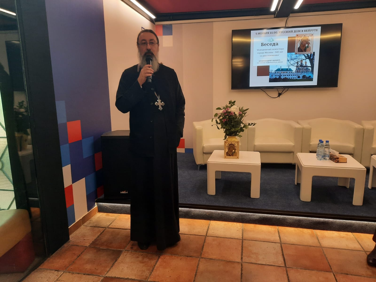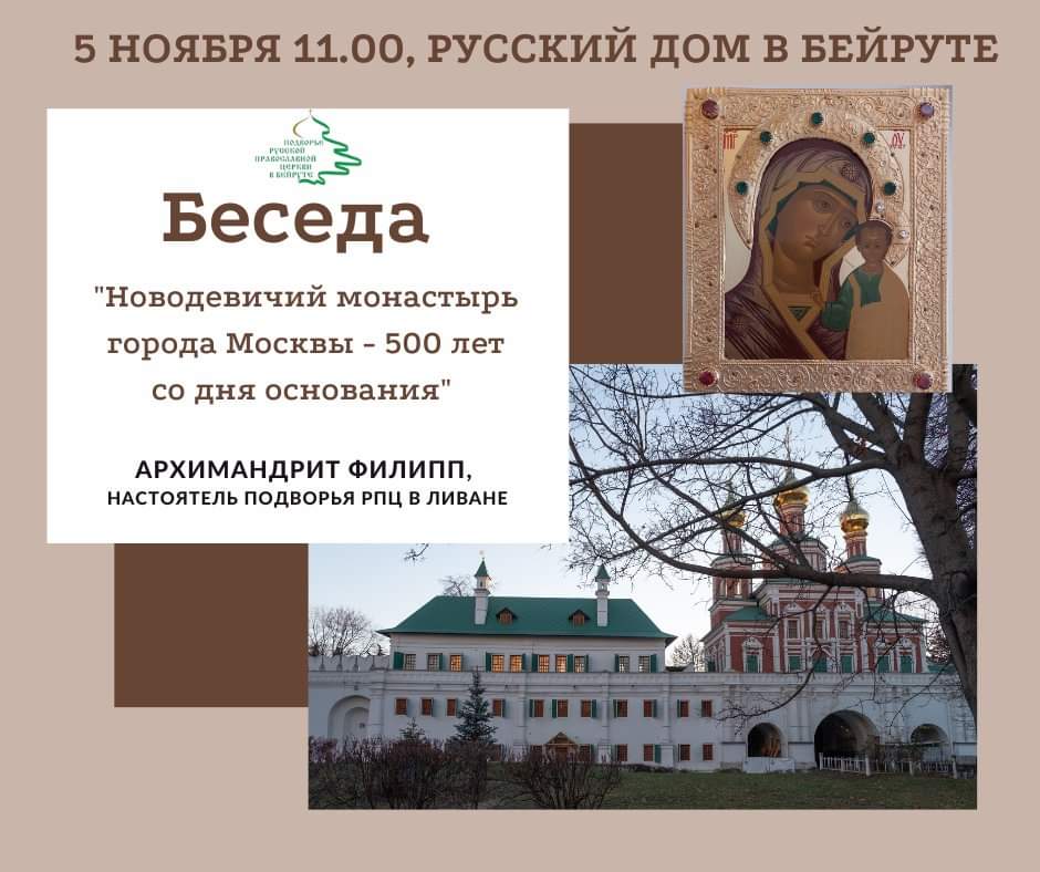 В субботу, 5 ноября, в «Русском доме» в Бейруте в рамках празднования Дня народного единства России состоялась беседа настоятеля Подворья Русской Православной Церкви в Ливане архимандрита Филиппа на тему: «Новодевичий монастырь города Москвы. 500 лет со дня основания».