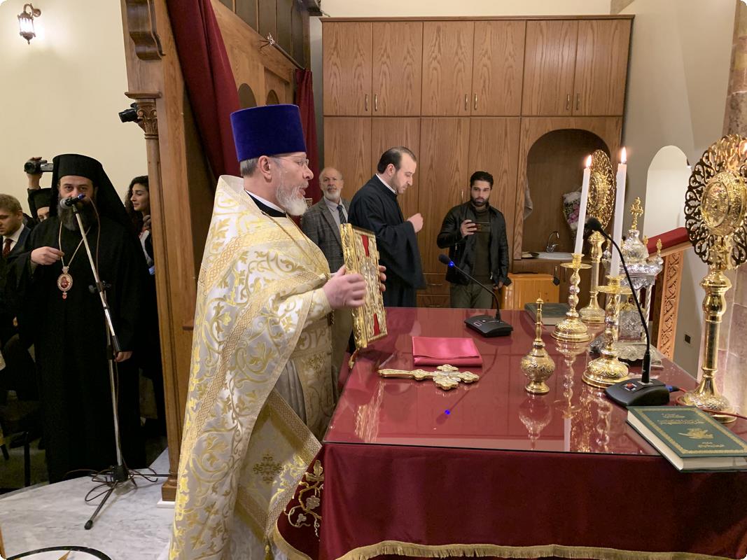 В алтаре молились епископ Ларисский Моисей и епископ Селевкийский Роман. В храме присутствовали Чрезвычайный и Полномочный посол России в Сирии А.В. Ефимов, командующий группой войск Вооруженных сил Российской Федерации в Сирийской Арабской Республике генерал-полковник А.Н. Сердюков, исполнительный директор Фонда поддержки христианской культуры и наследия Е.И. Скопенко, представители местных органов власти. Богослужение совершалось на арабском и церковнославянском языках.