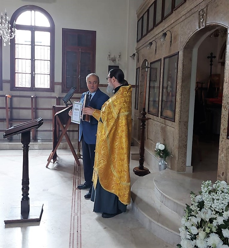 Затем архимандрит Филипп поздравил Чрезвычайного и Полномочного Посла Российской Федерации в Ливане с высокой наградой Русской Православной Церкви , орденом в честь святого и благоверного великого князя Александра Невского и вручил ему Благодарственную грамоту Подворья Русской Православной за помощь в организации визита в пределы Антиохийской Православной Церкви Председателя отдела внешних церковных связей Московского патриархата митрополита Волоколамского Антония.